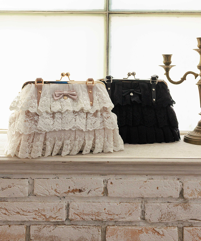 【設計】 層層堆疊的細緻蕾絲打造豐富立體感,展現浪漫復古氛圍。正面小巧蝴蝶結作為優雅點綴,細節精緻。口金設計可大幅開闔,方便拿取與確認物品;加寬底部設計擁有良好容量與收納力。附可拆式背帶,亦可作為肩背包使用,提升實用性。