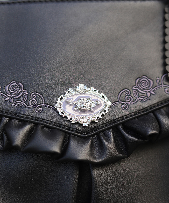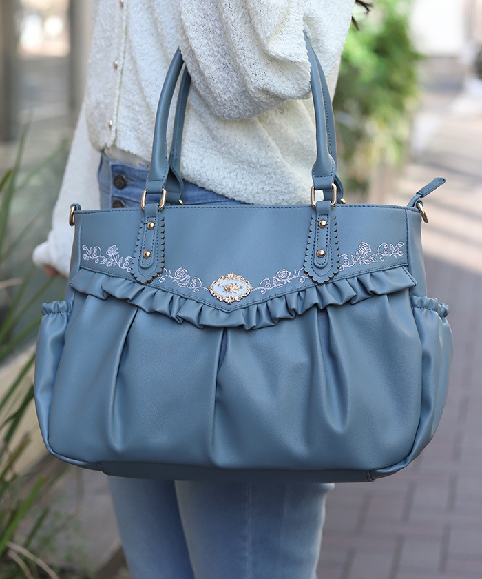 【商品介紹】 以精緻玫瑰刺繡與荷葉邊點綴的A4托特包,華麗甜美兼具實用性,容量寬敞可收納文件與日常用品,是新生活或日常外出的理想包款。