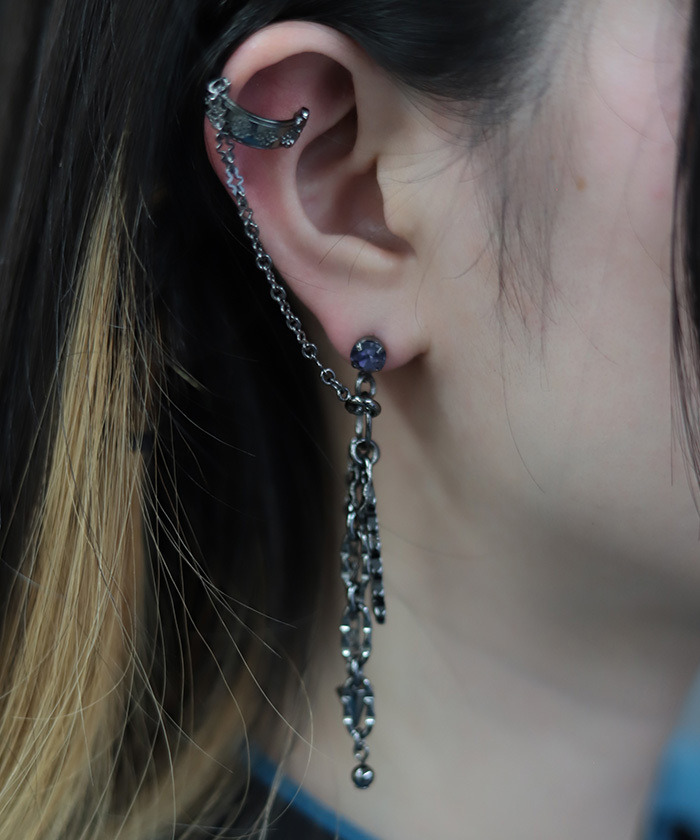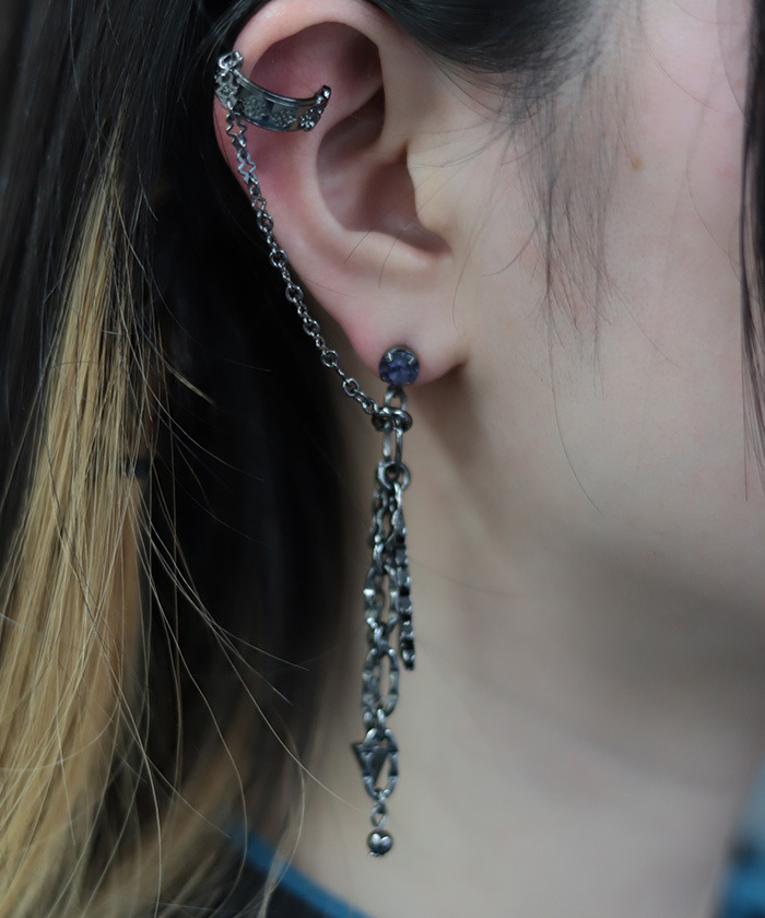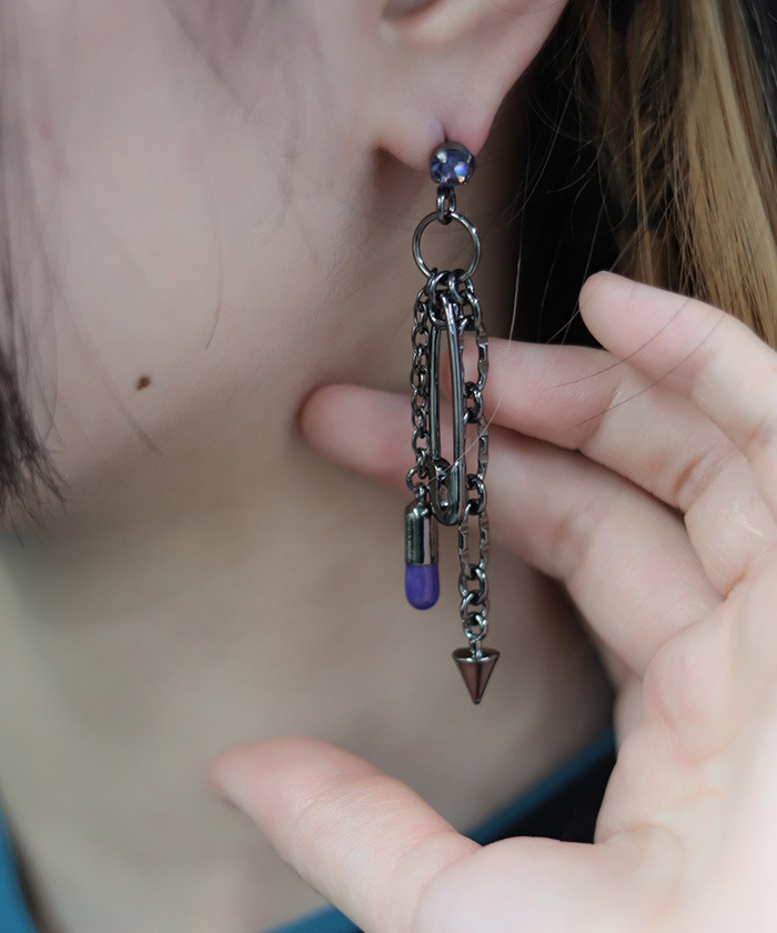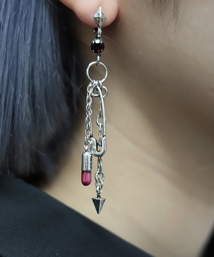 【設計】 以「NIBBLE」LOGO吊飾與刻印「POISON」的膠囊造型為主視覺,搭配安全別針風格元素,營造暗黑甜酷風格。附耳環轉換器,可自由切換耳針與耳夾兩種佩戴方式。耳扣設計可拆卸,增加造型變化性與實用性。