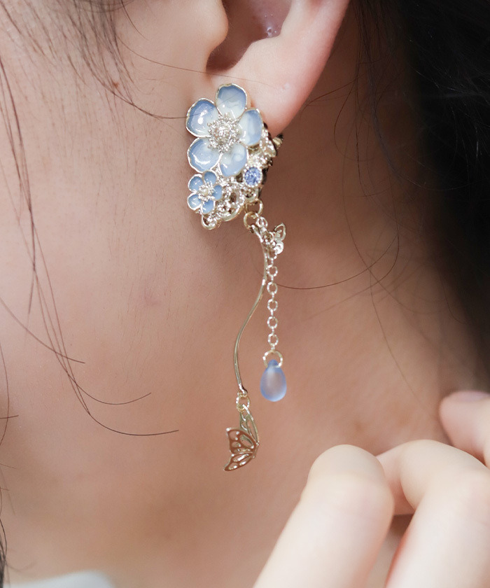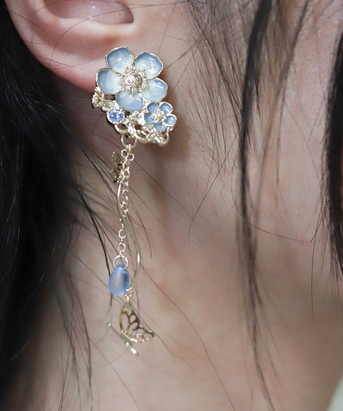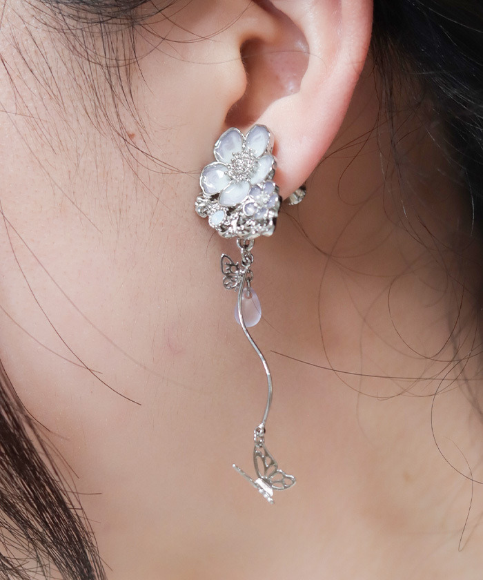 【商品介紹】 夢幻粉蝶花造型耳環,結合垂墜珠飾與蝴蝶細節,打造優雅又輕盈的日系花系飾品。
