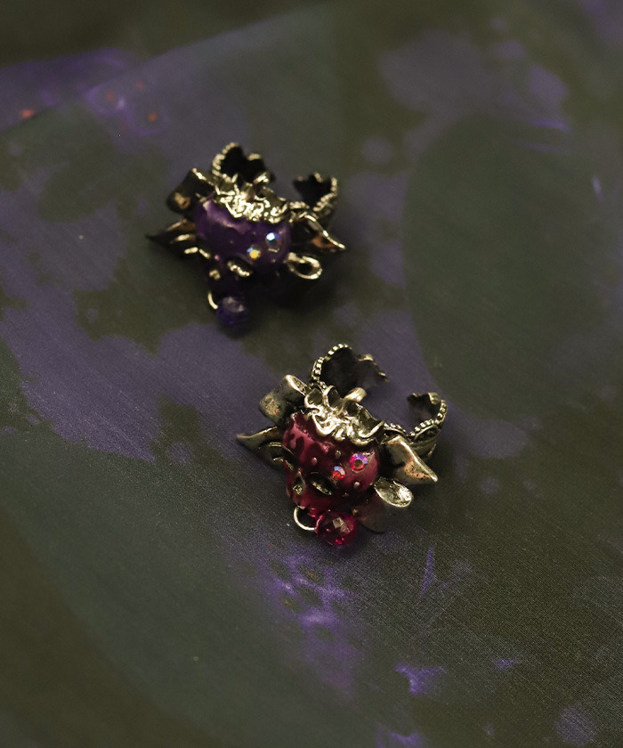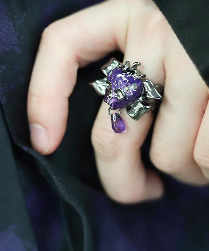 【設計】 以毒莓骷髏造型草莓為主題的戒指,採用可自由調整尺寸的開放式設計。戒環上點綴蕾絲裝飾與蝴蝶結造型,甜美與毒感兼具。閃爍的極光色水晶為整體造型增添亮點,紅色款帶粉紅感的古銀色鍍層,紫色款則為藍紫色搭配鍍鎳金屬質感。