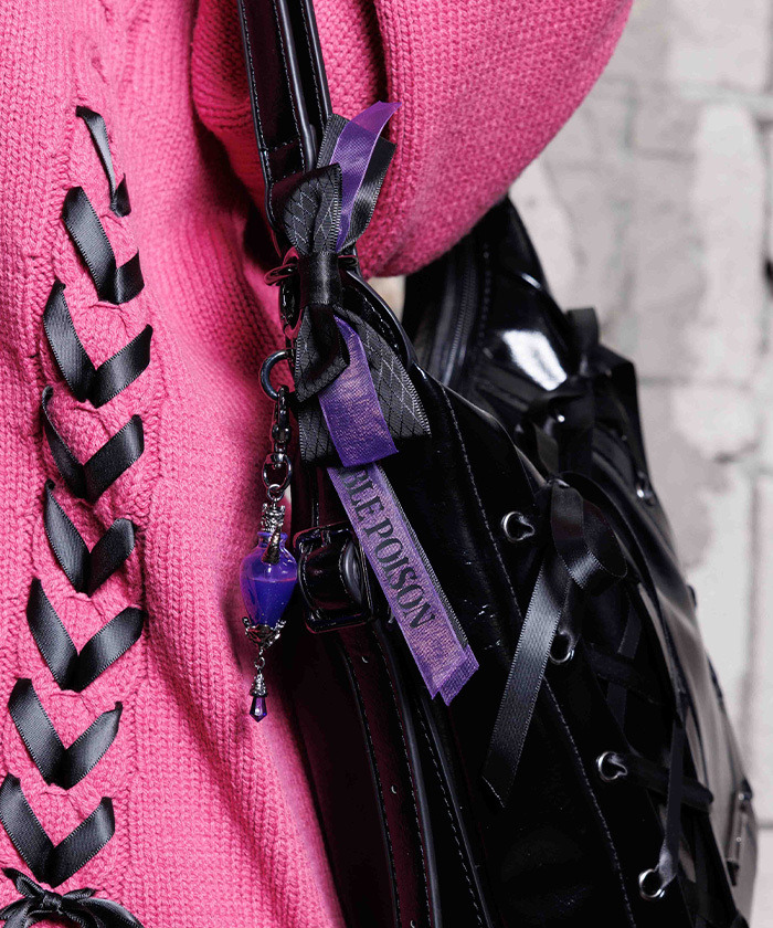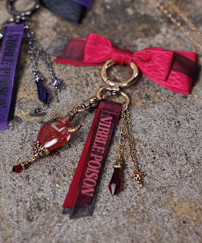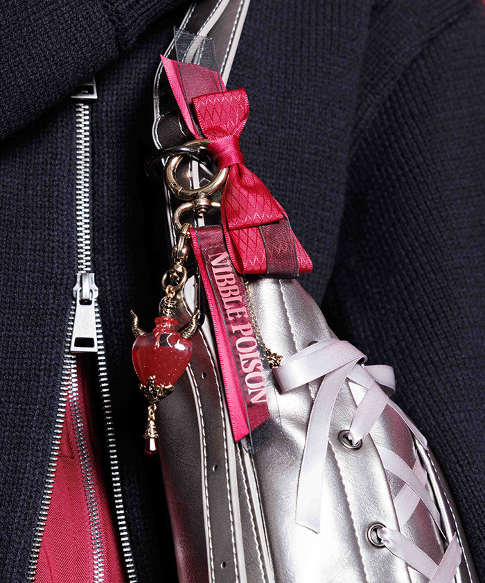 【設計】 以心形瓶裝滿對你的思念,靈感來自愛情魔藥的閃耀包包吊飾。心形小瓶吊飾帶有微小惡魔角,搭配蝴蝶結與品牌LOGO織帶,能為現有手提包增添可愛亮點。中間呈現液體流動感設計,不會溢出,兼具甜美與暗黑小惡魔風格。