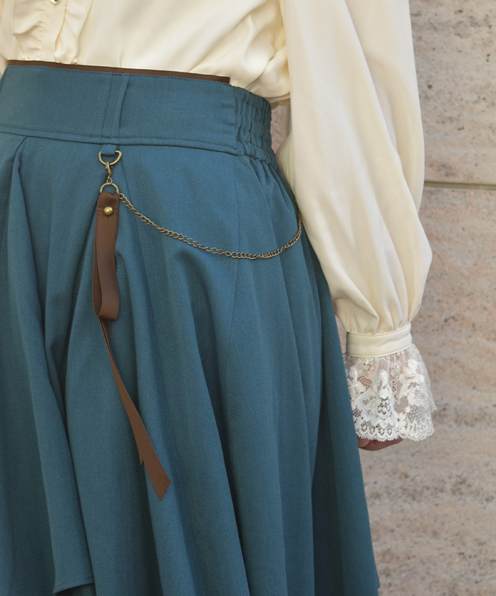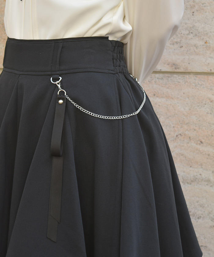【設計】 表情豐富的不對稱剪裁,讓裙擺隨動作優雅展開。鈕扣與鍊條細節成為視覺亮點,平衡甜美與率性氛圍,營造微酷感的成熟風格。