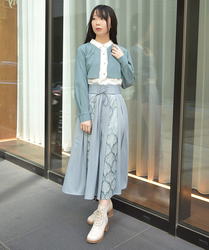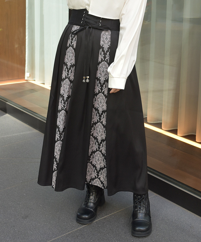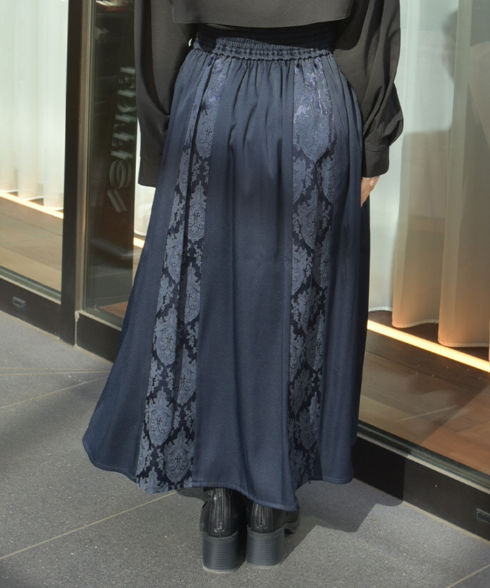 【設計】 拼接提花布料低調增添華麗感,在沉穩氛圍中展現層次與質感。腰部以綁帶設計作為亮點,同時修飾身形,打造俐落優美的輪廓線條。