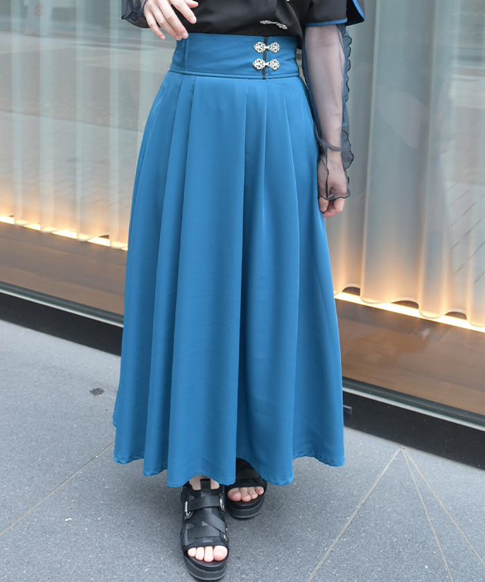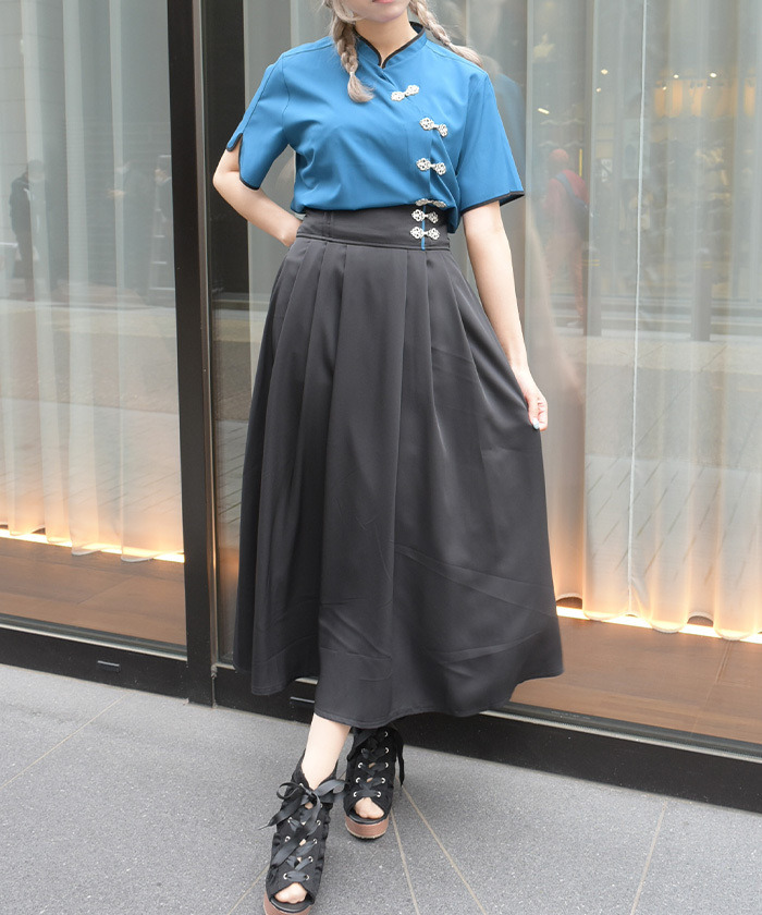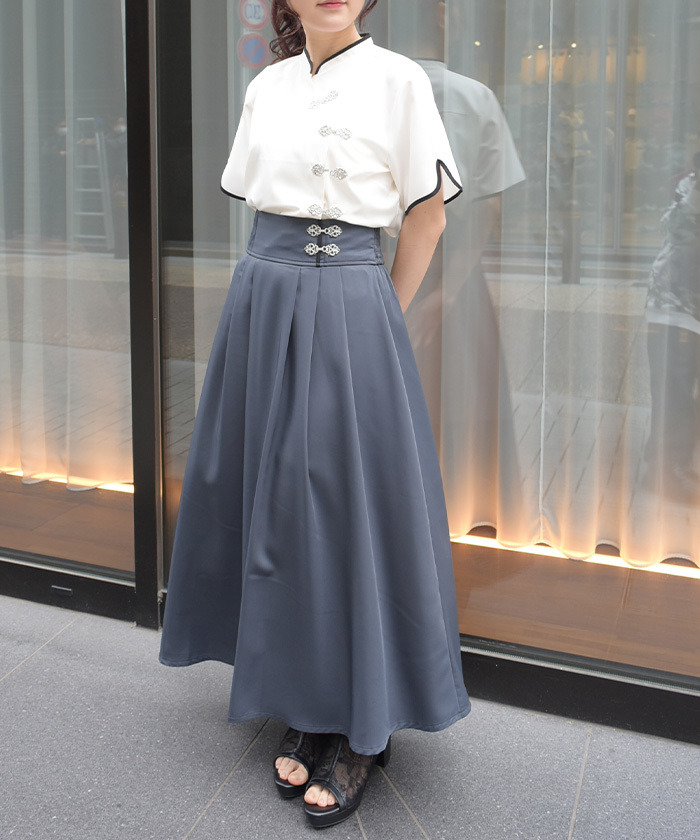 【商品介紹】 中式盤扣點綴的高腰長裙,結合優雅剪裁與可調式設計,展現簡約中帶個性的日系長裙單品。