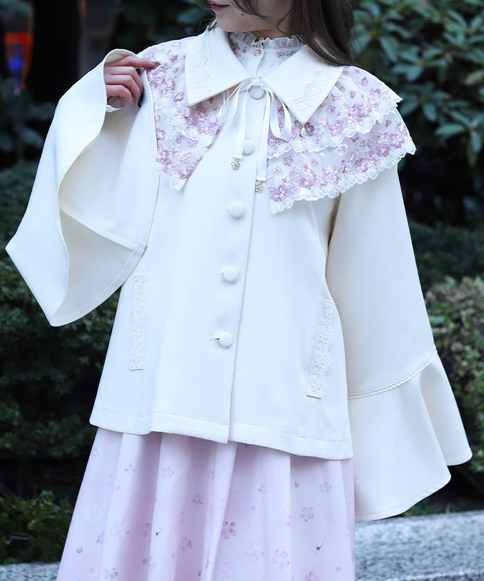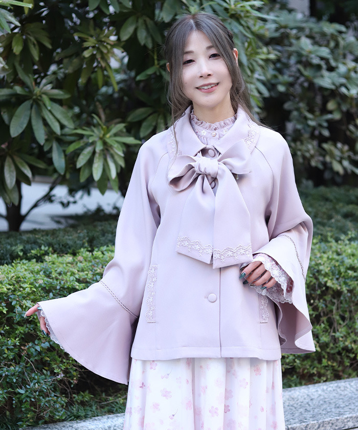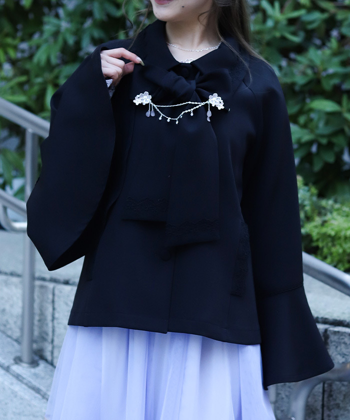 【設計】 領口、口袋邊緣與蝴蝶結末端加入薄紗刺繡蕾絲裝飾,細節精緻。領尖點綴水滴形珍珠,即使取下蝴蝶結也能保有優雅亮點。圓潤包扣設計則增添整體甜美氛圍。