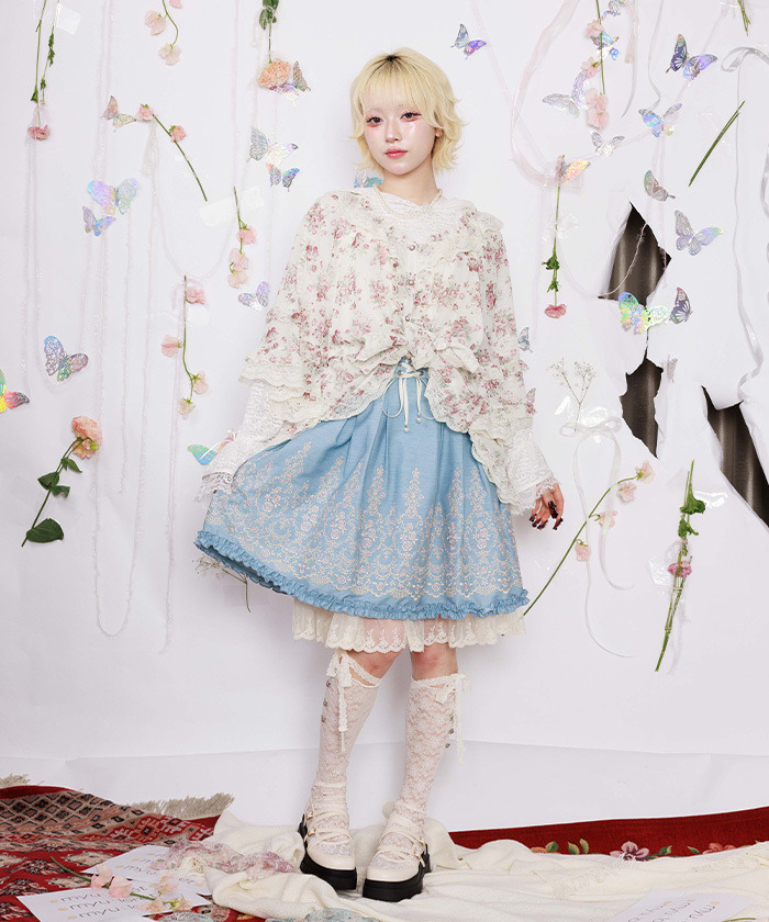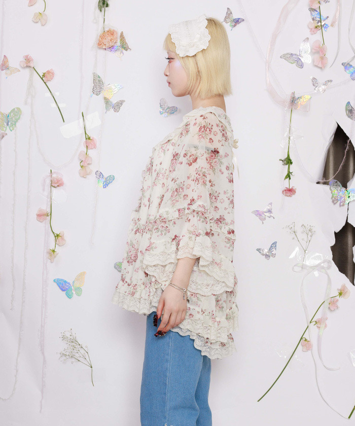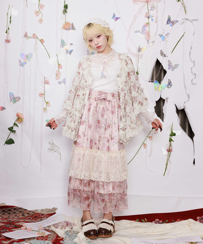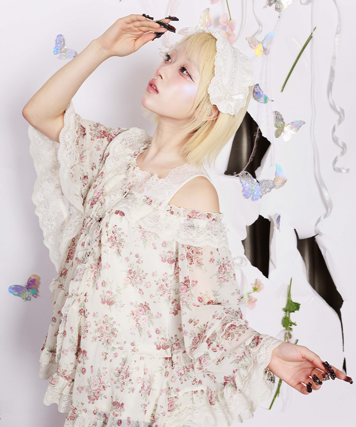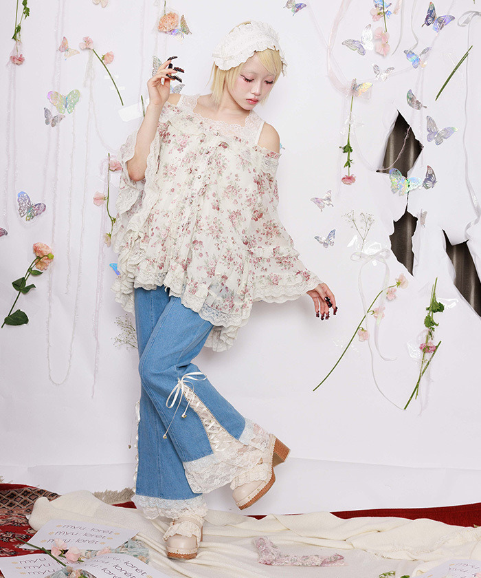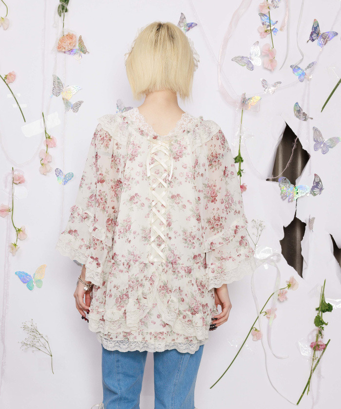【商品介紹】 來自 myu:lorét -ミュウロレット- 的浪漫薔薇印花斗篷上衣,輕盈雪紡材質搭配柔和線條,營造優雅飄逸感。