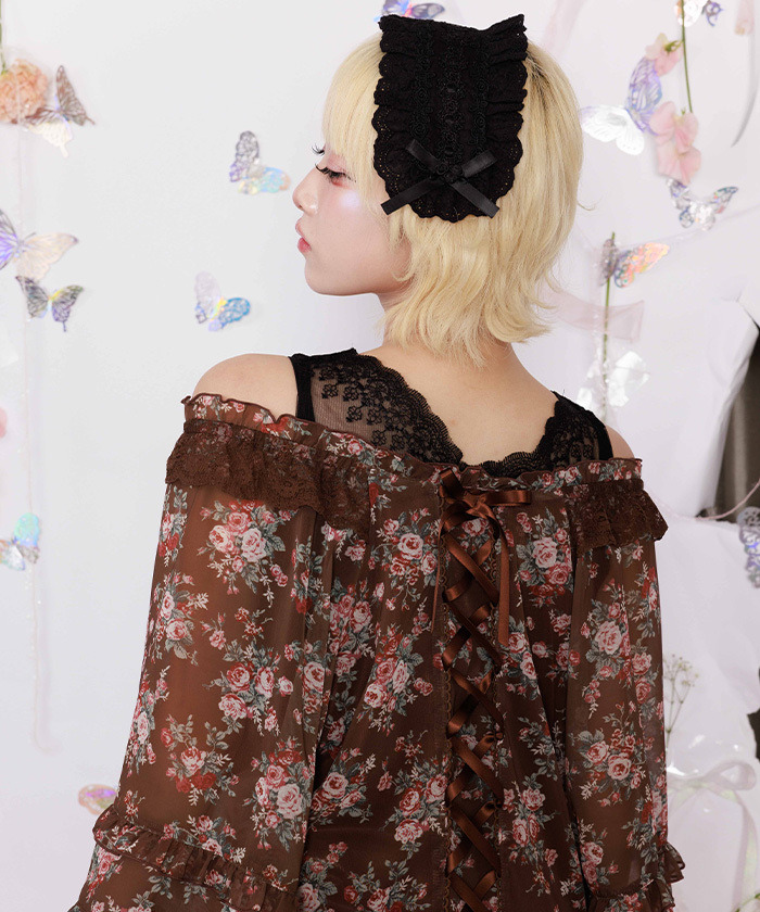 【設計】 寬鬆的落肩版型搭配柔軟雪紡面料,身體部分內裡有彈性襯裡增加舒適度。袖子透視感適中,肩部彈性設計可作為斜肩穿搭,前排鈕扣可全開當作罩衫使用。後背設計有蕾絲綁帶,展現背部細節之美。