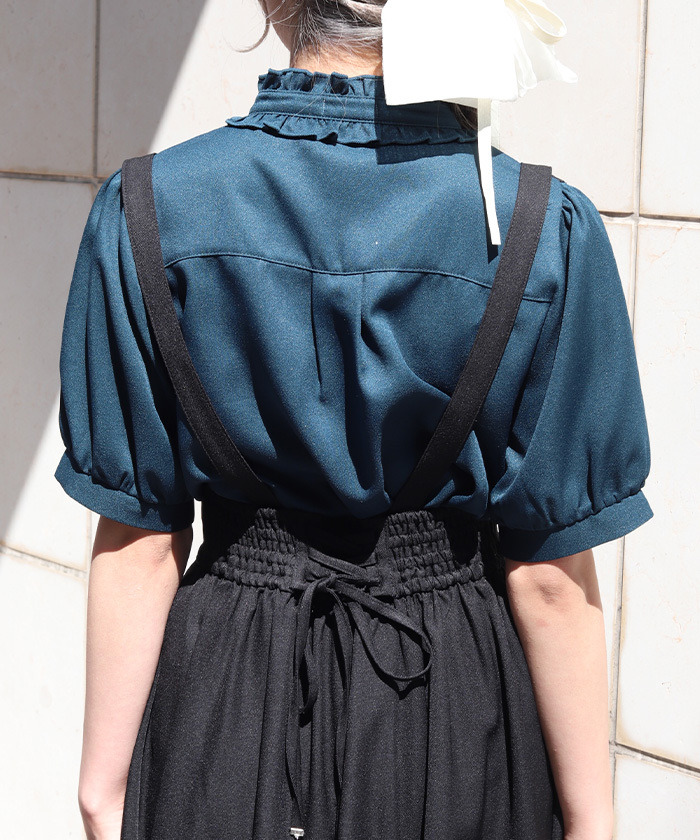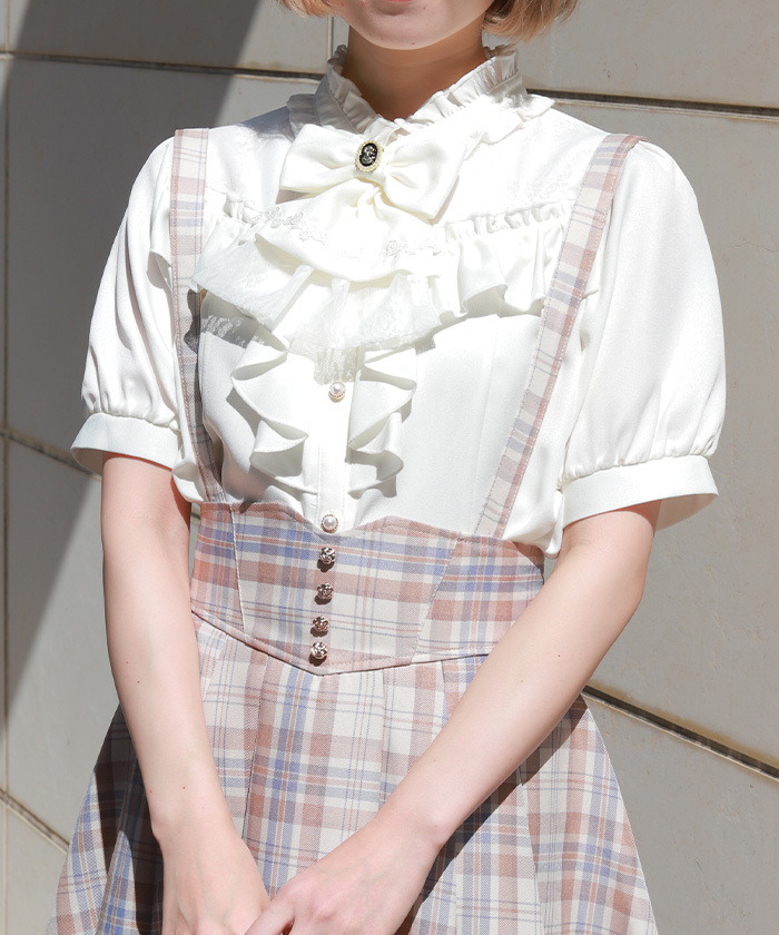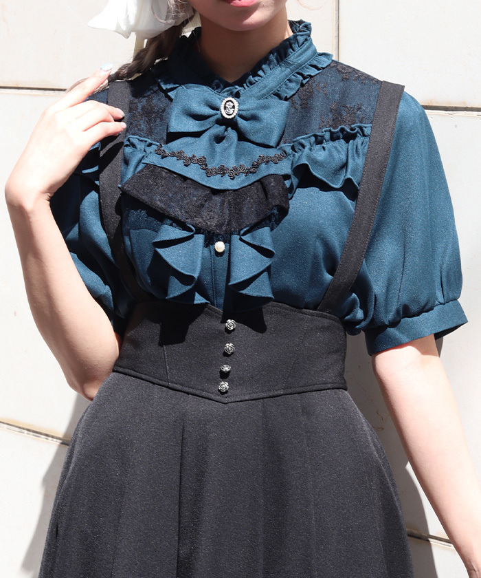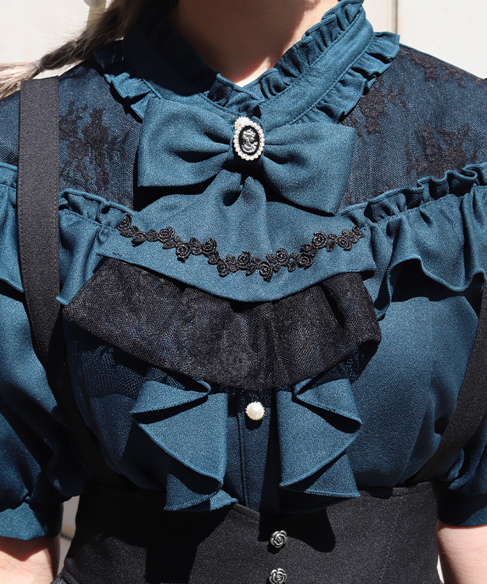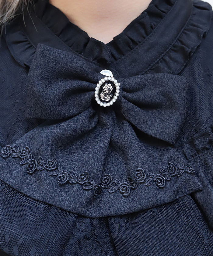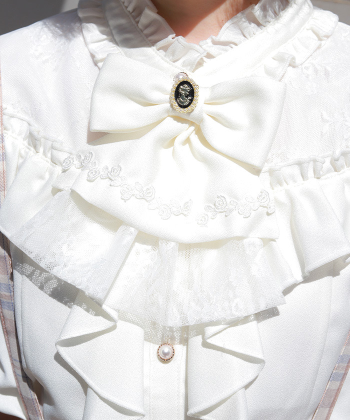 【商品介紹】 前襟層疊荷葉邊與蝴蝶結點綴,優雅華麗的女性感襯衫,附可拆式胸針與迷你卡梅奧別針,細節精緻可調整。