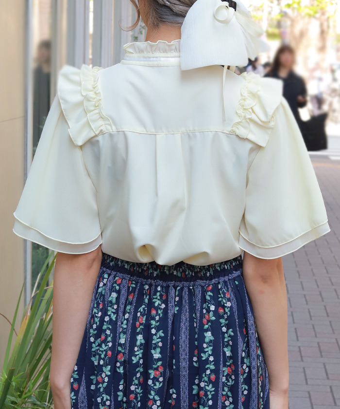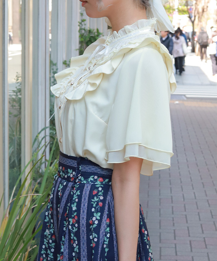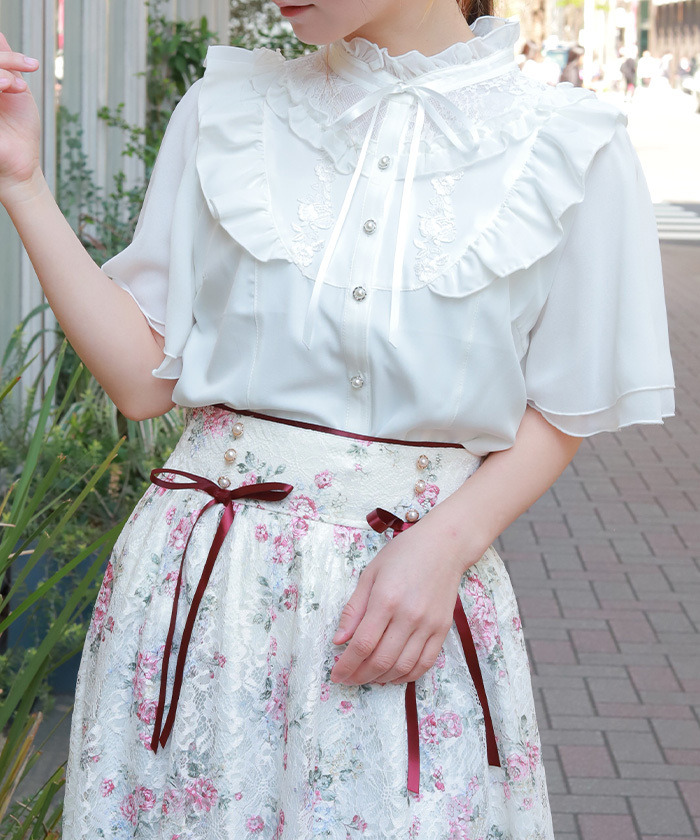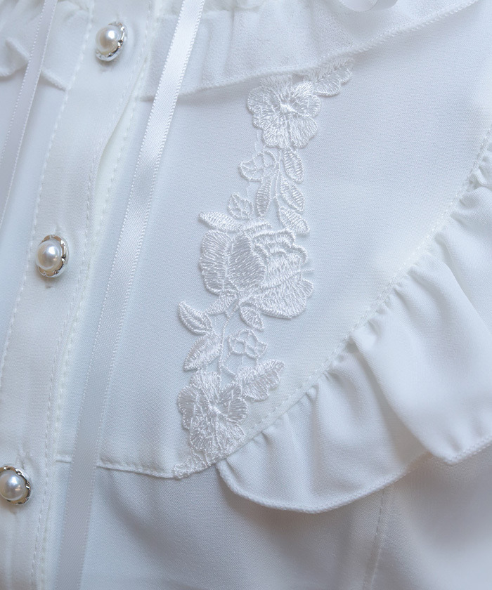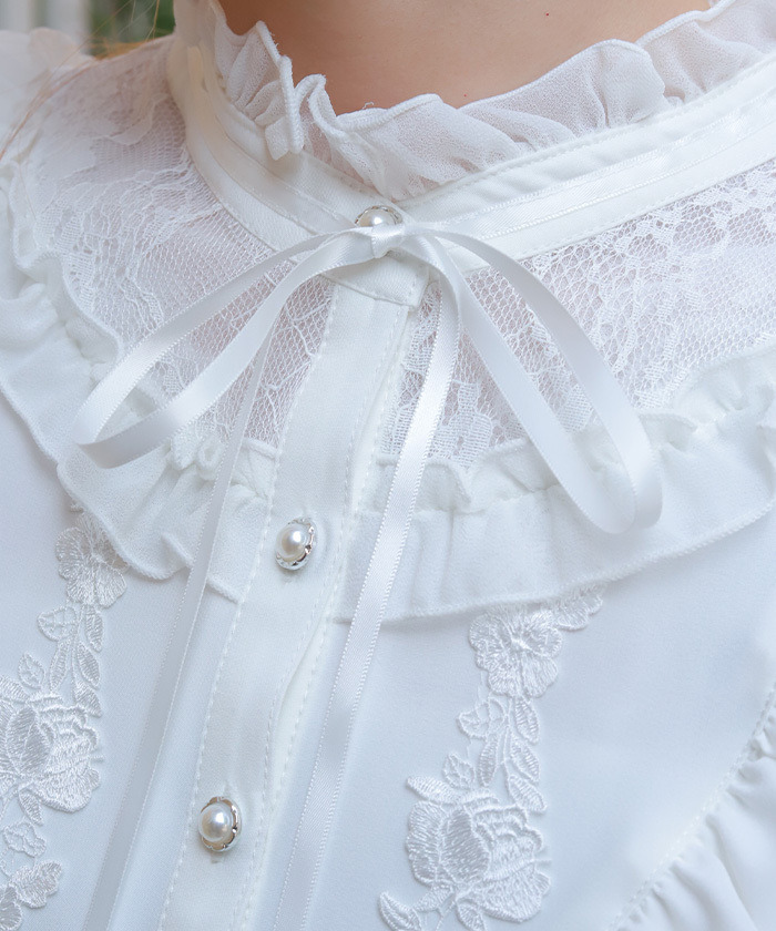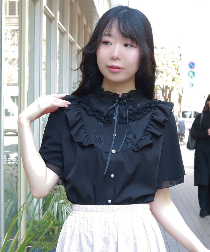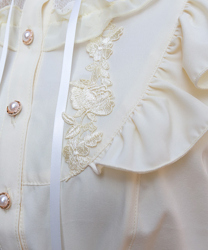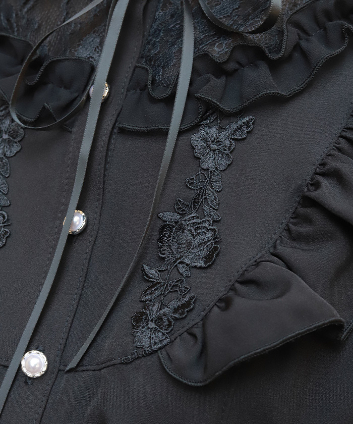 【設計】 採用輕柔雪紡面料,穿著舒適透氣。約克位置結合荷葉邊與蕾絲拼接,並搭配花卉圖樣的化學蕾絲,展現細緻又浪漫的氛圍。立領小荷葉設計讓頸部線條更俐落,同時與胸前的份量感荷葉形成完美平衡。荷葉袖剪裁可自然修飾手臂線條,兼具造型與實用性。