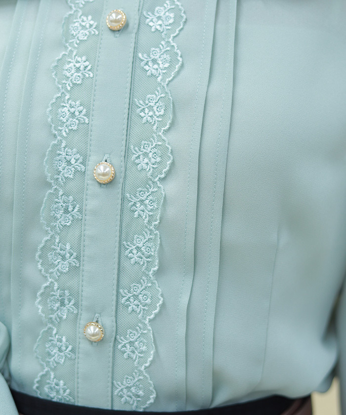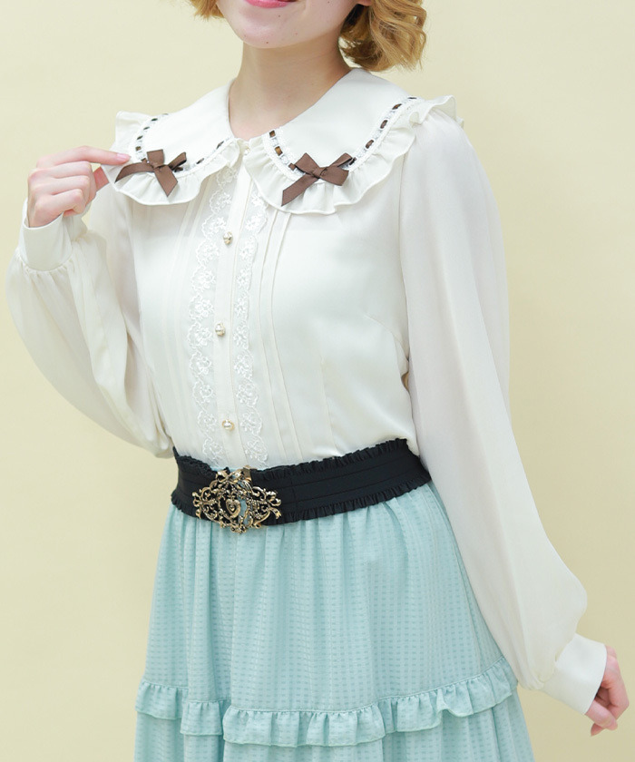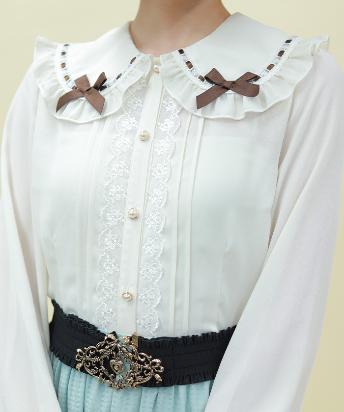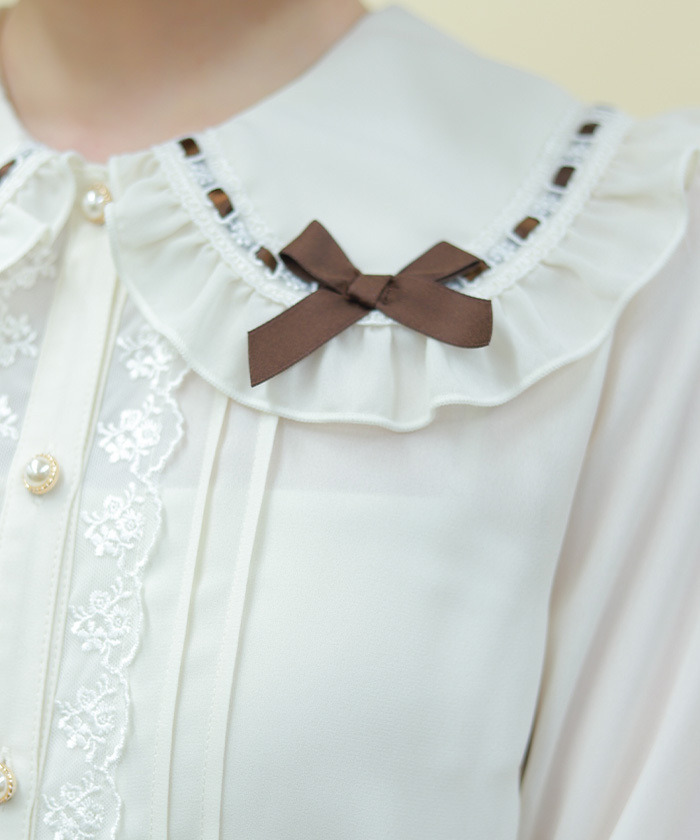 【商品名稱】巧克力色拼接蝴蝶結蕾絲襯衫。