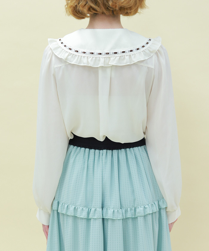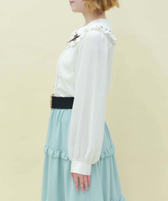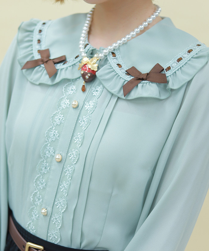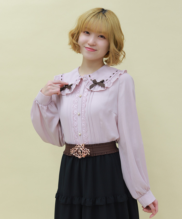 【商品設計 】甜美圓領設計,領口施以拼色梯形蕾絲與蝴蝶結裝飾,增添細緻少女感。輕透面料,適合春季穿搭,打造柔美浪漫日系風格。可作內搭或單穿,呈現層次感造型。