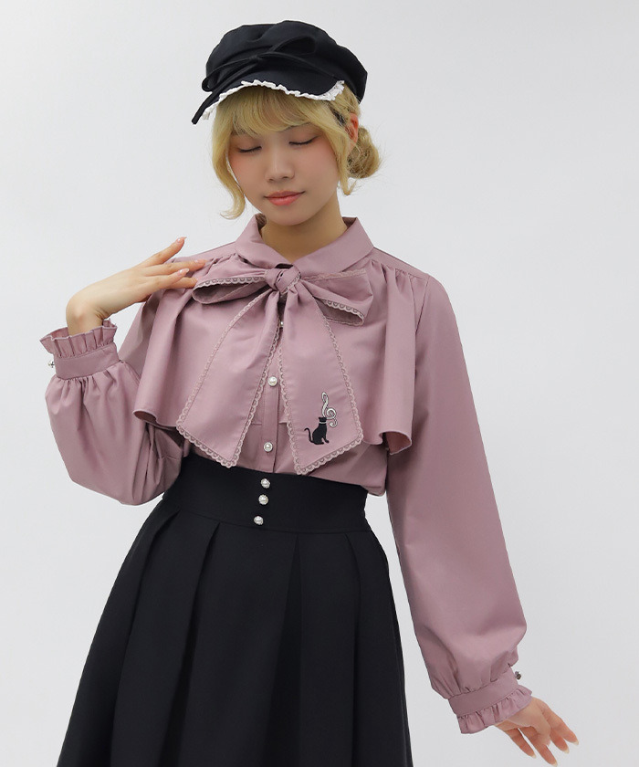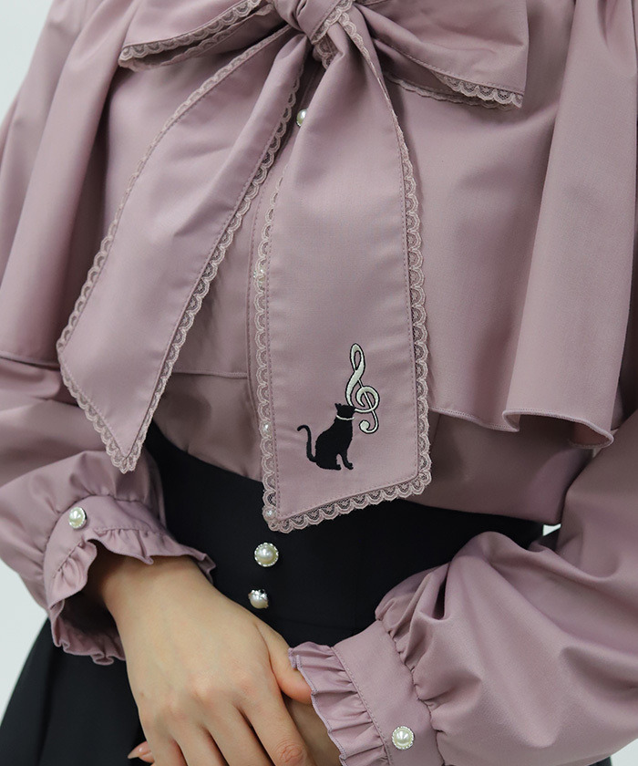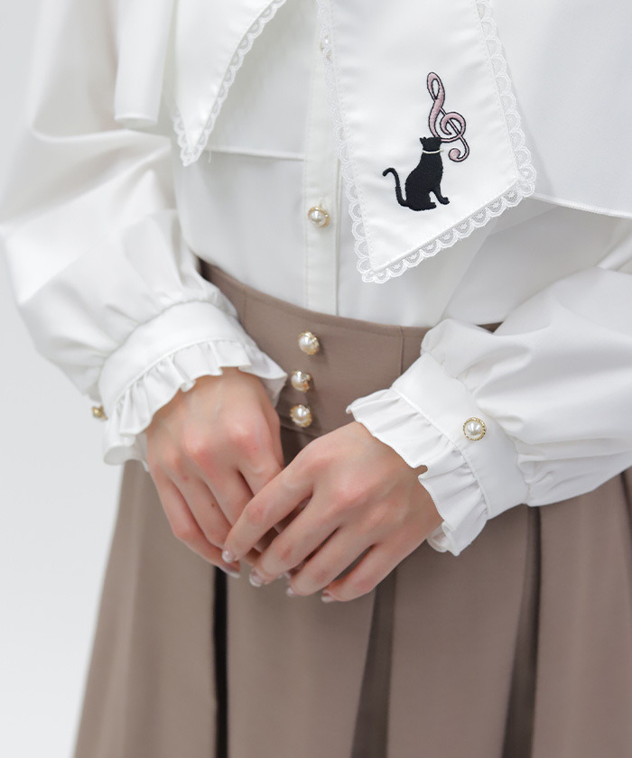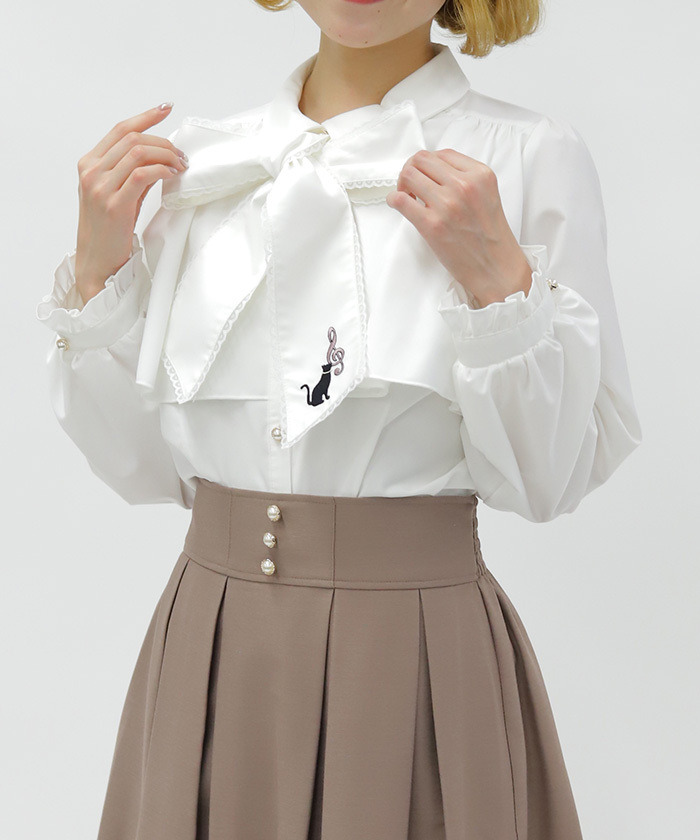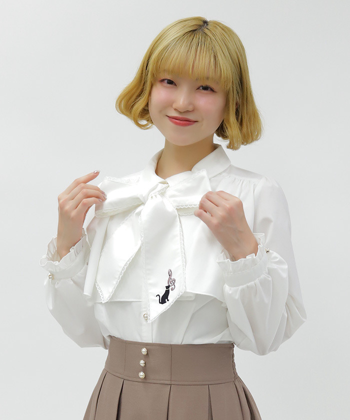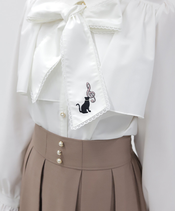 【商品介紹】 領口蝴蝶結綴上可愛貓咪刺繡的襯衫,以「貓咪×音符」為主題,甜美又富有趣味感,是少女感穿搭的亮眼單品。