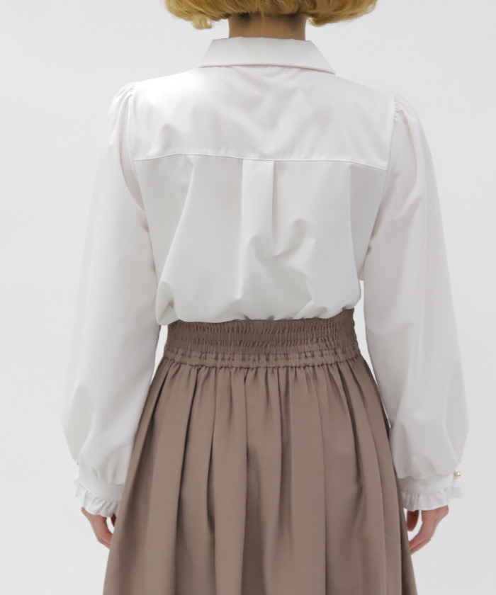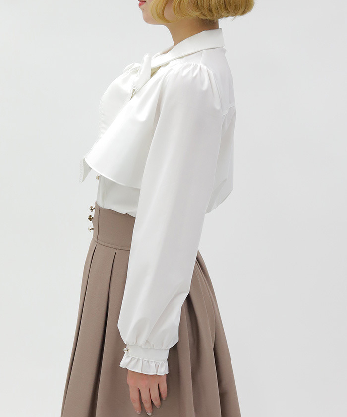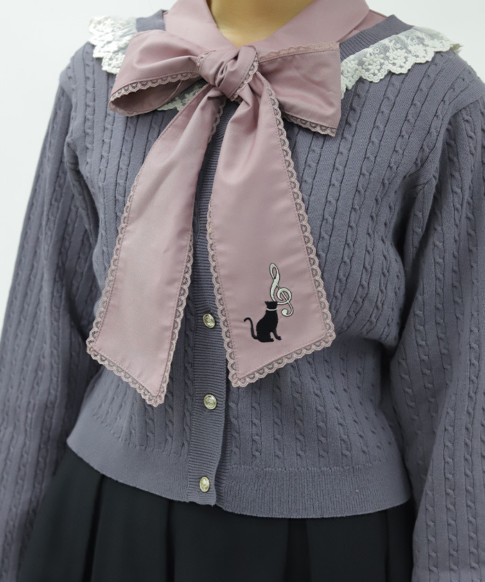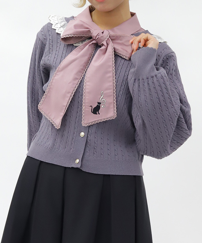 【設計】 以貓咪與音樂為靈感,蝴蝶結領帶設計搭配立體刺繡貓咪圖案,面料適度挺括,讓蝴蝶結更具存在感。袖口喇叭設計增添時尚感,兼具俏皮與優雅氣質。