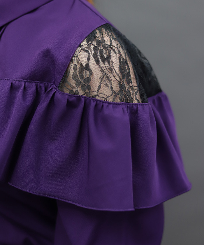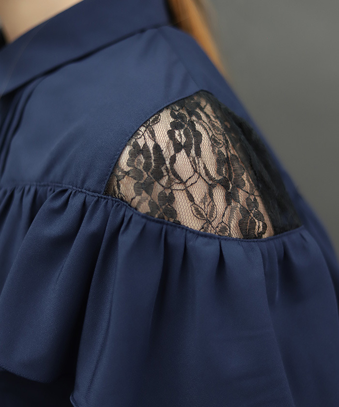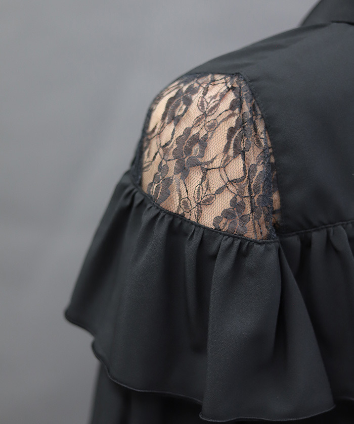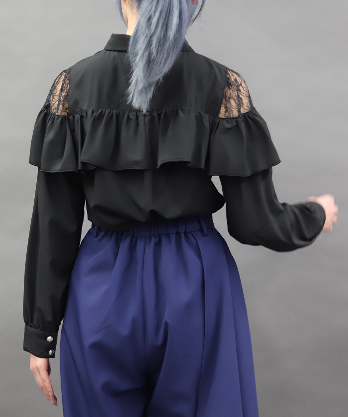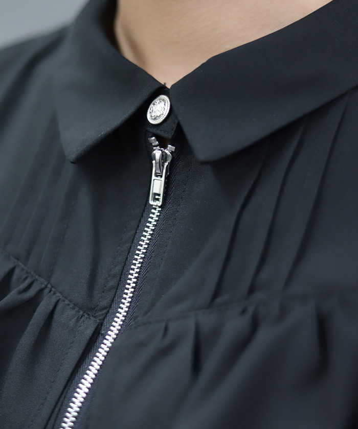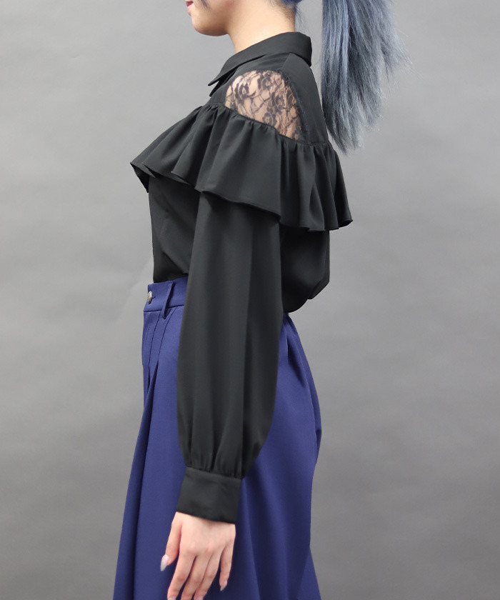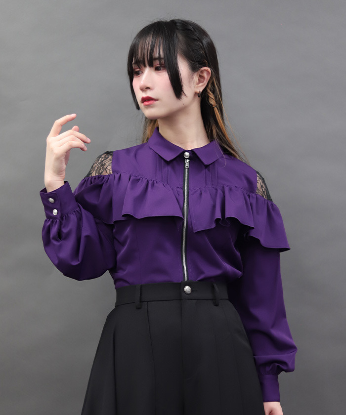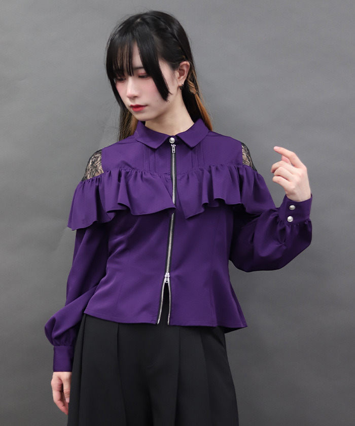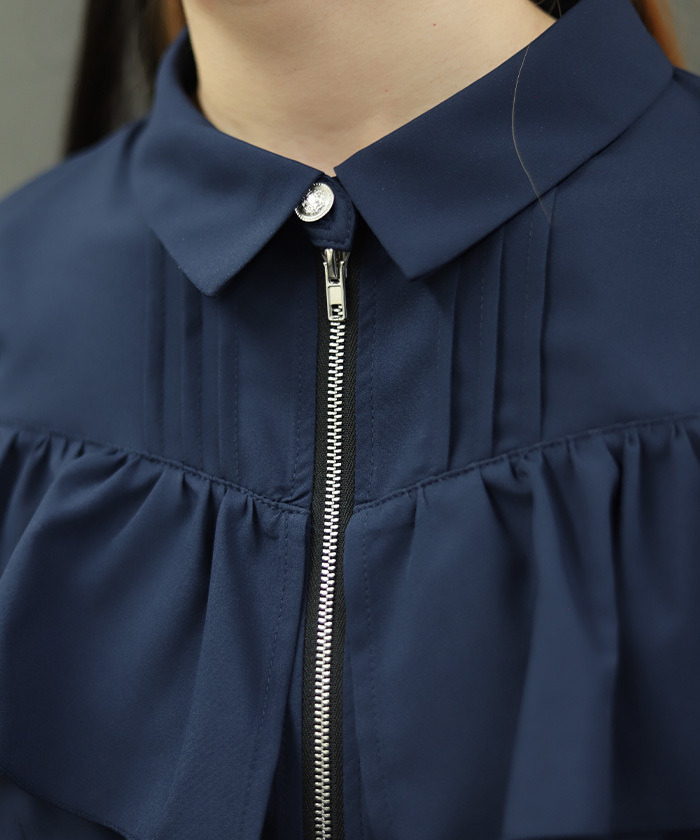【設計】 前方拉鍊設計成為視覺亮點,展現率性個性。肩部荷葉邊與蕾絲透膚細節為整體增添柔美層次,在酷感氛圍中注入優雅氣息。整體剪裁不過於甜美,帶有俐落感,特別適合搭配褲裝造型。