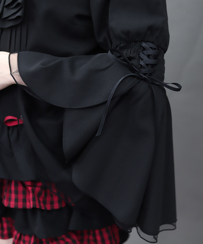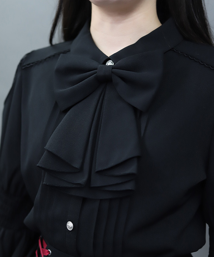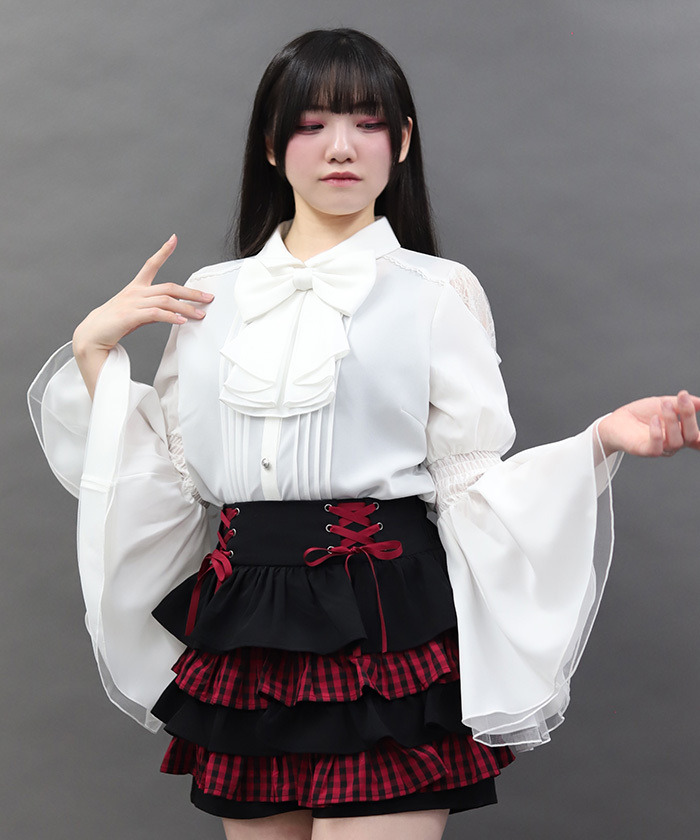 【設計】 大量荷葉邊打造的公主袖風格設計,呈現華麗感十足的襯衫。 蝴蝶結採用鈕扣可拆式設計,即使不擅長綁蝴蝶結也能輕鬆穿著。 肩部挖空搭配蕾絲裝飾,以及袖子的綁帶設計,從任何角度都充滿細節感的可愛單品。 袖口為鬆緊抓皺設計,具有彈性,穿著俐落又舒適。