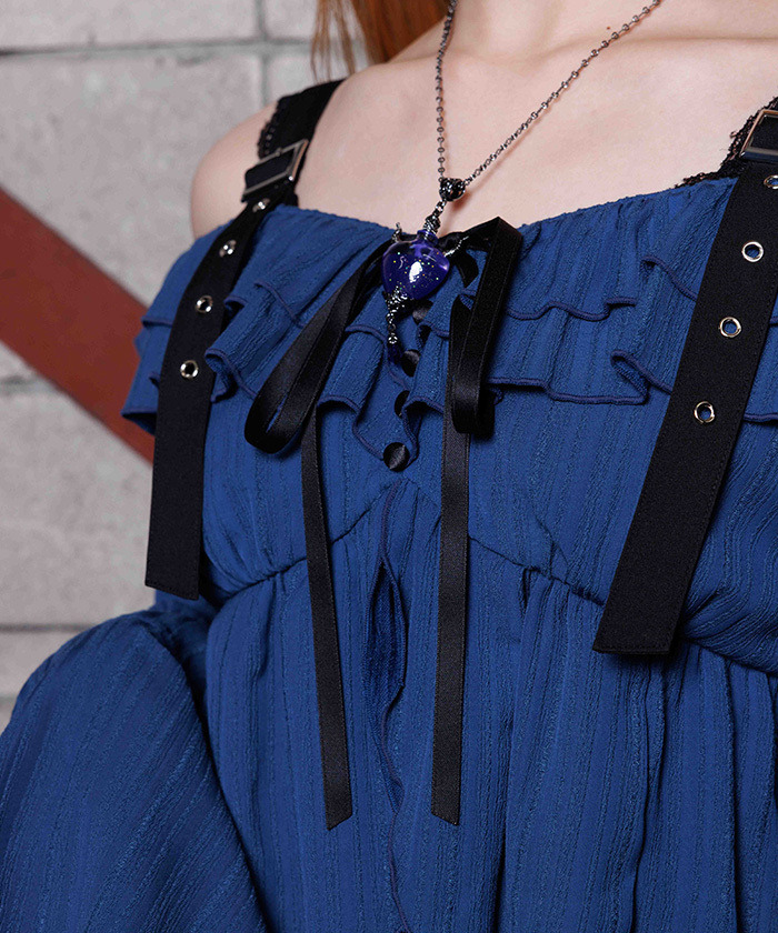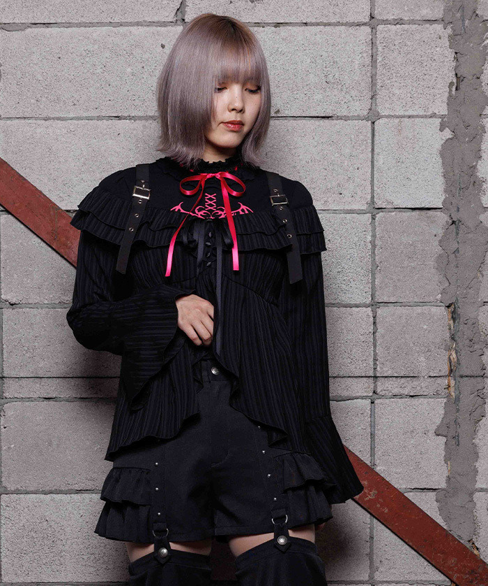 【穿搭建議】 建議與荷葉邊褲腿套分離褲 搭配,打造略帶 Y2K 感的哥德風褲裝造型。