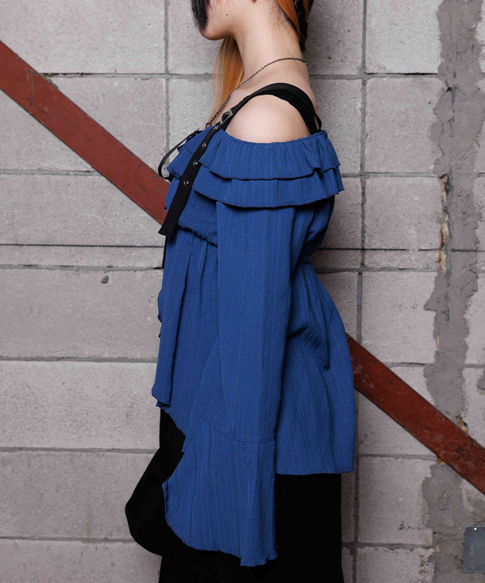 【設計】 這款上衣結合荷葉邊與腰帶設計,甜美中帶俏皮個性。 露肩款式可多種穿搭變化,搭配不同內搭可展現健康肌膚小心機。 條紋提花元素增添低調細節感。