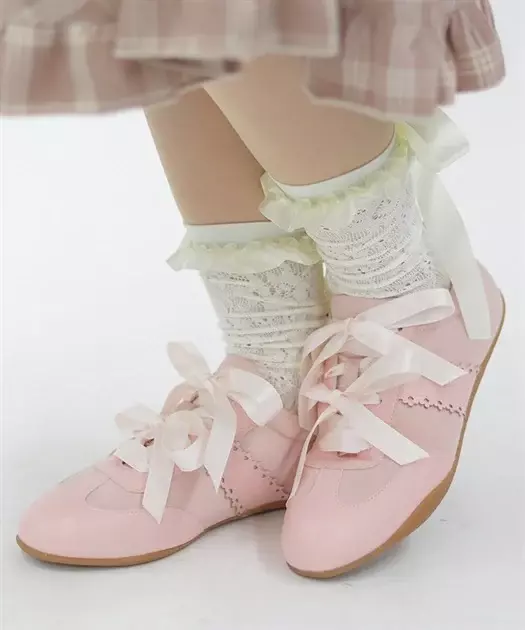 【設計】 鞋面採用柔和配色搭配雙層緞帶裝飾,細節心形雕花鏤空增添甜美感,平底鞋型舒適好走,兼具實用與可愛造型,是少女感穿搭必備單品。