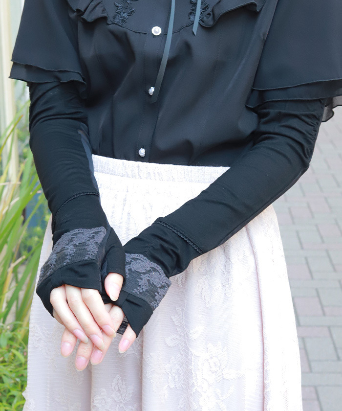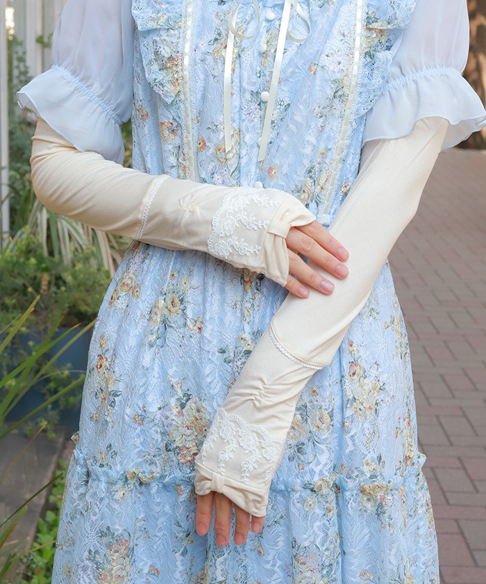 【設計】 以蝴蝶結風拼接結合細緻薄紗蕾絲,營造華麗層次感。抓皺設計與滾邊蕾絲細節增添精緻度。內側採網布材質,透氣舒適不悶熱。長版設計可完整包覆手臂,有效阻擋紫外線。