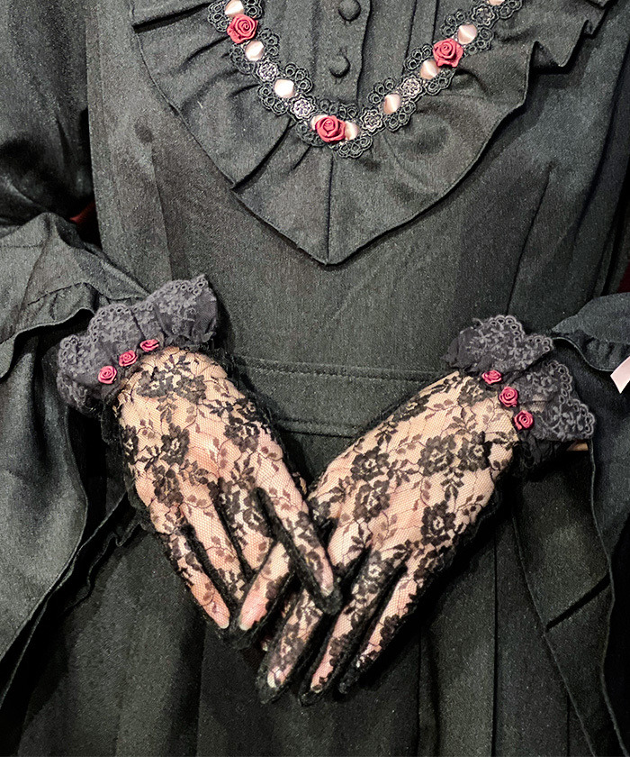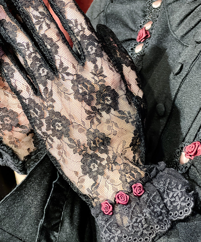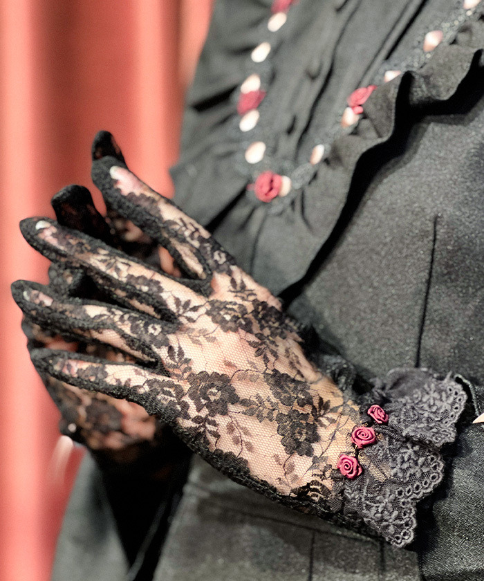 【設計】 手腕處搭配緞帶纏繞玫瑰裝飾,作為華麗亮點。細膩的花卉蕾絲材質,展現柔美精緻風格,能為穿搭增添優雅層次,是完成氣質造型的加分單品。