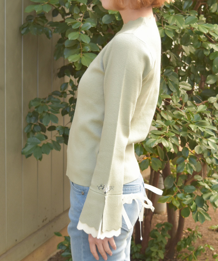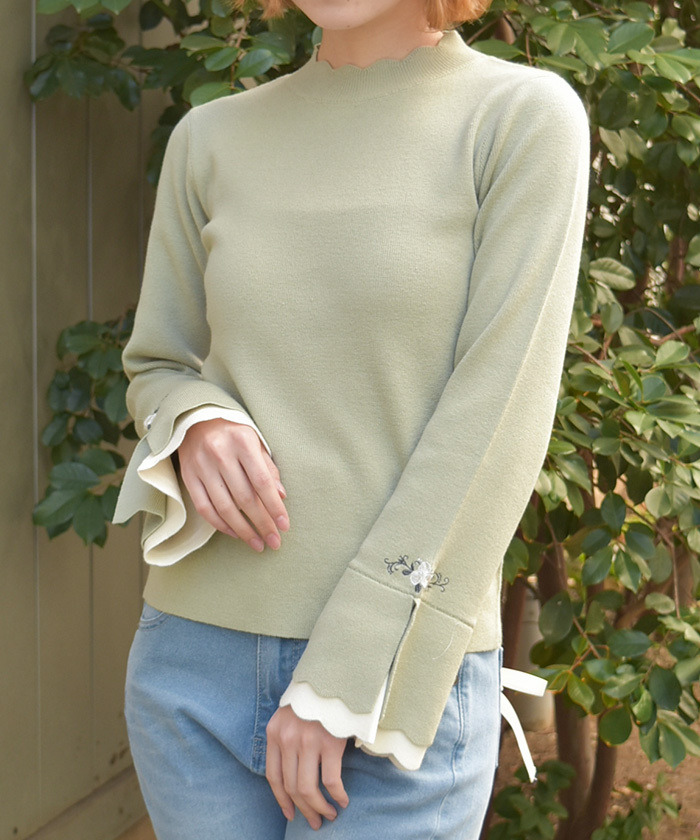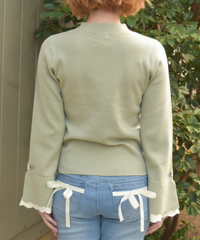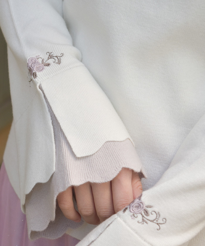 【商品名稱】 「玫瑰刺繡拼色喇叭袖針織上衣」