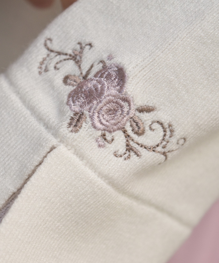 【商品設計】 採柔軟舒適材質,手感彈潤細膩。領口與袖口設計為荷葉邊造型,袖子呈喇叭形,增添甜美女性感。搭配橄欖綠×米色、米色×粉色或黑×白等低調拼色,並以橫向蔓延的玫瑰刺繡增添成熟優雅氛圍。