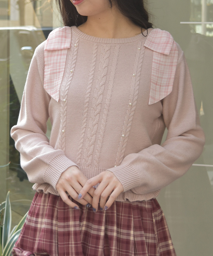 【設計】 肩部蝴蝶結使用帶有透膚感的雪紡材質,搭配春色系格紋,展現輕盈氛圍。 針織本體則以簡約麻花紋為主,點綴排列珍珠,增添柔美與女性氣質。