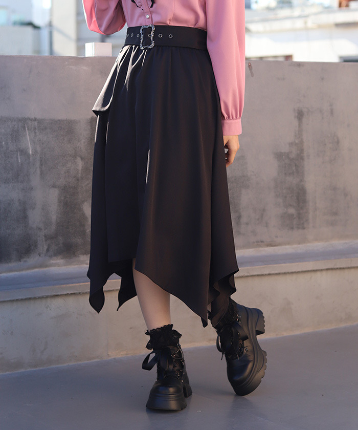 【設計】 這款不規則下擺裙是造型亮點單品。 特色口袋設計增添趣味細節。 搭配附贈腰帶可拉長垂掛,營造隨性慵懶感。 腰部後側為彈性設計,穿著舒適且容易活動。