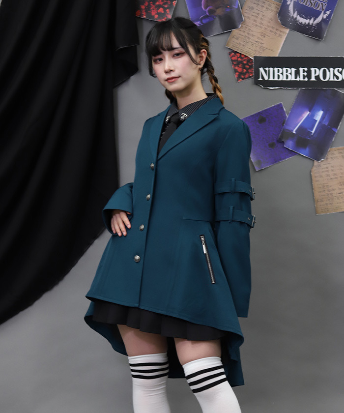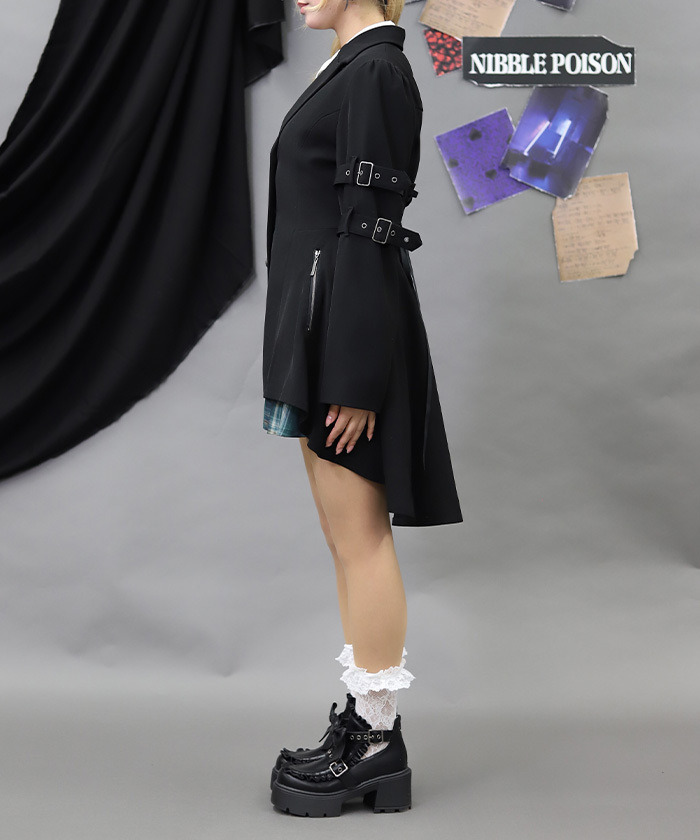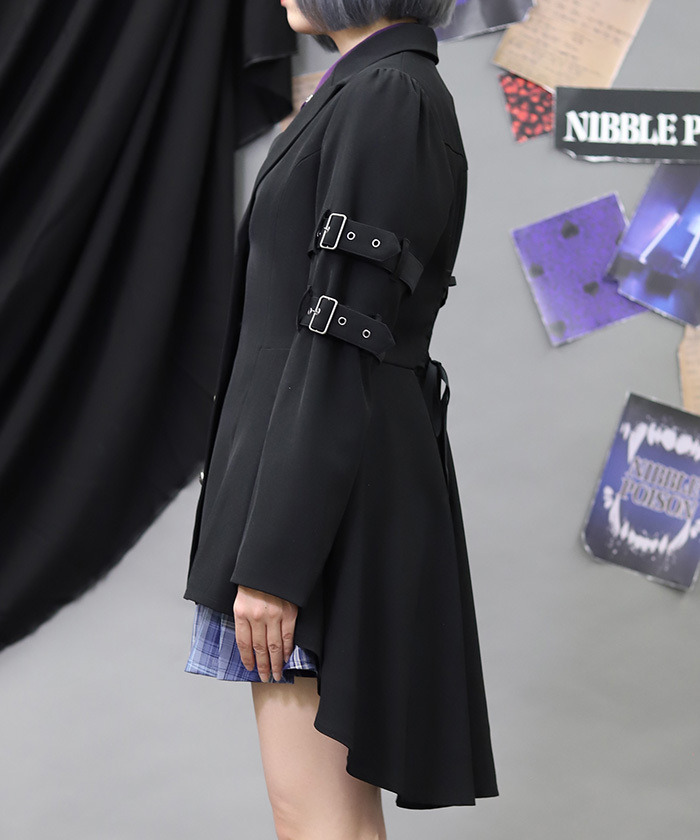 【商品介紹】 袖口皮帶設計點綴個性細節,結合魚尾剪裁修飾身形比例,甜美中蘊藏叛逆氣息,展現率性學院風格,是兼具造型感與存在感的個性外套單品。