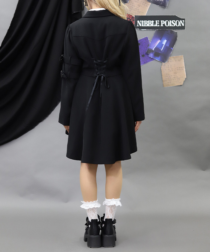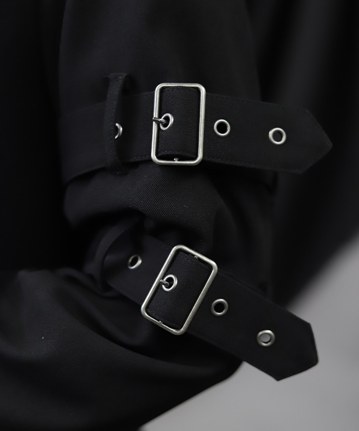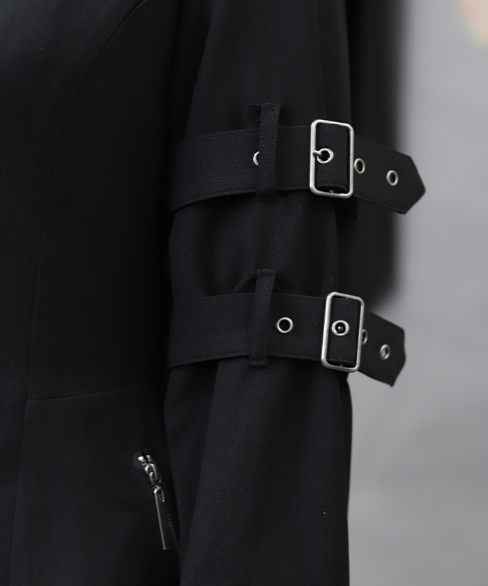 【設計】 袖口加入皮帶設計作為視覺亮點,增添層次與造型感。下擺採魚尾剪裁,提升修身效果與動感線條。附有拉鍊口袋兼具實用機能,背面綁帶設計可自由調整輪廓,打造專屬曲線。