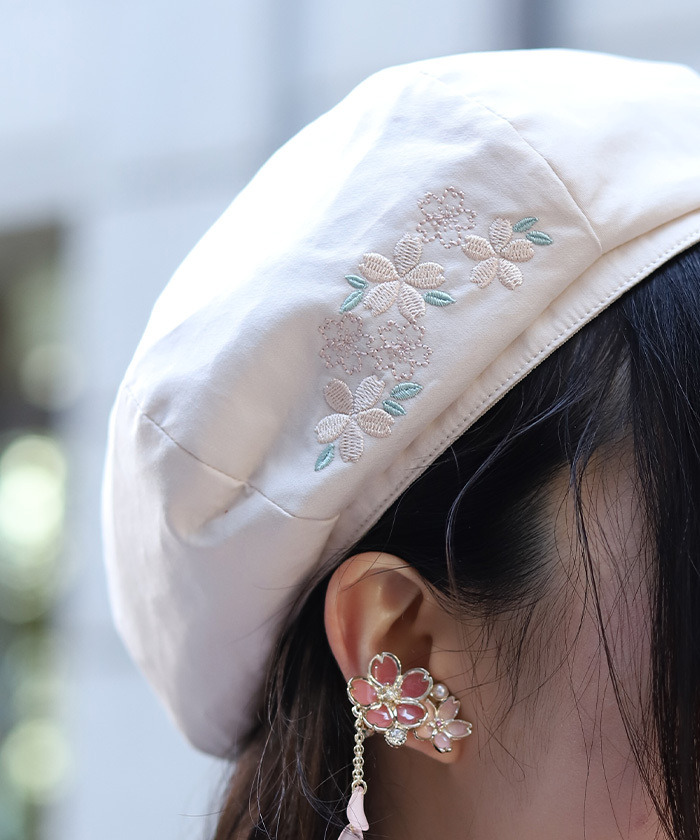【商品介紹】 以可愛櫻花為主題的刺繡設計貝雷帽。