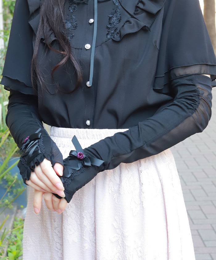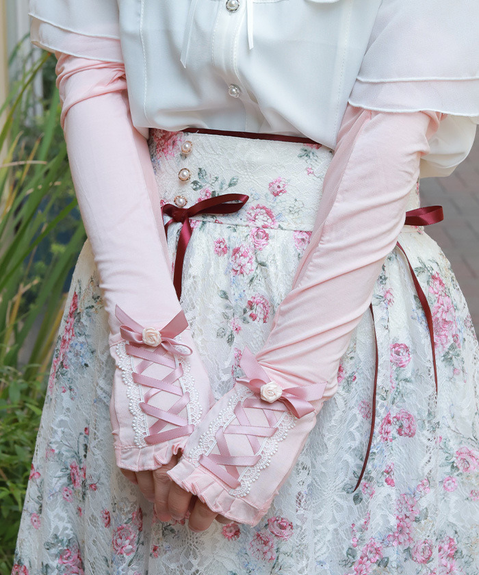 【設計】 採用修長貼手的長版設計,使整體手部線條更加俐落優雅。手背處以綁帶細節作為視覺亮點,增添造型感與精緻度。 點綴立體卷玫瑰裝飾,提升甜美與華麗氛圍。同時可有效覆蓋整個手臂,提供良好的紫外線防護,是兼具機能與裝飾性的實用配件。