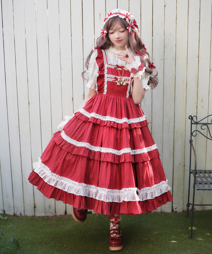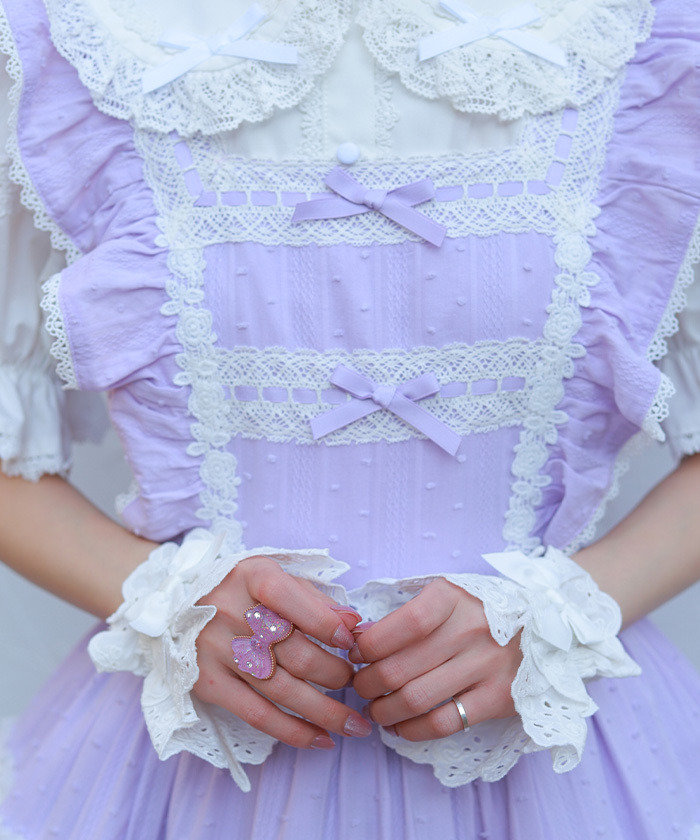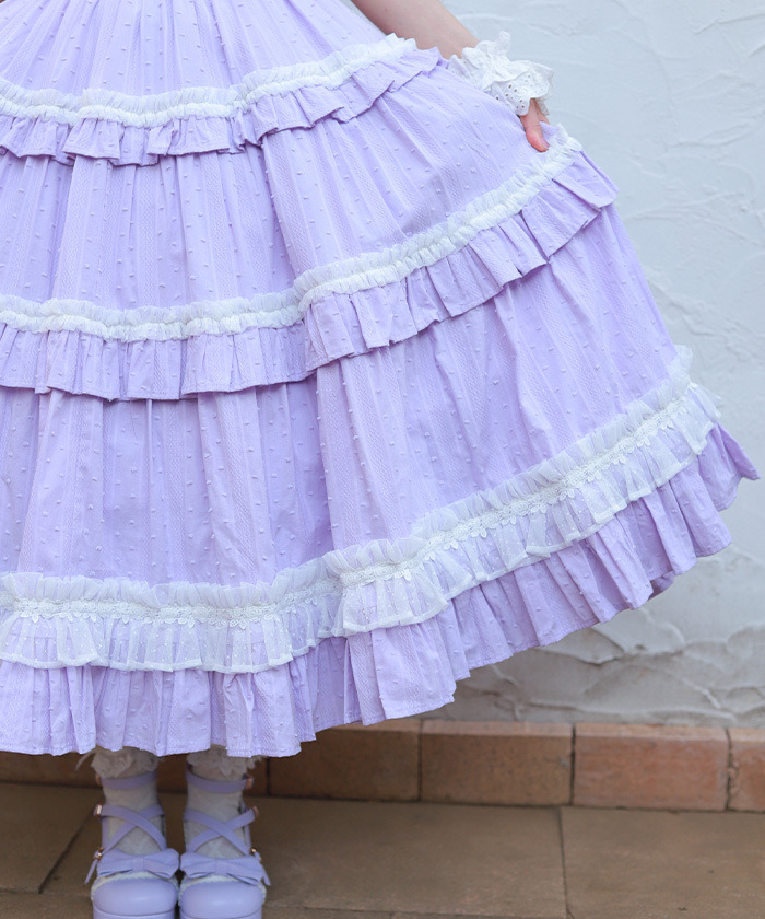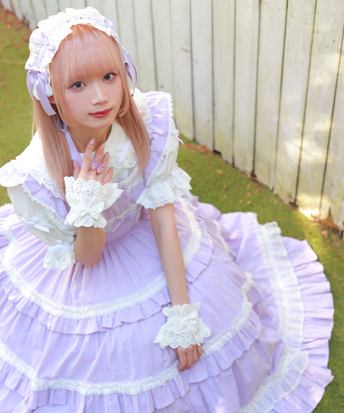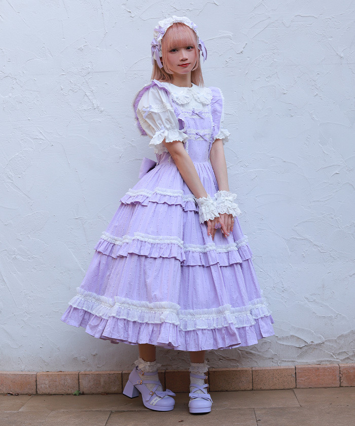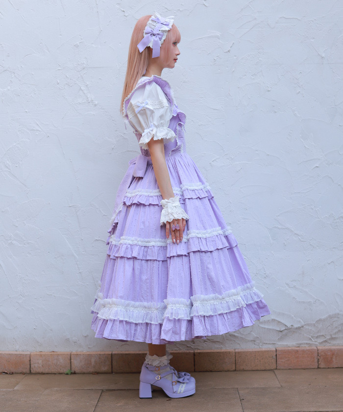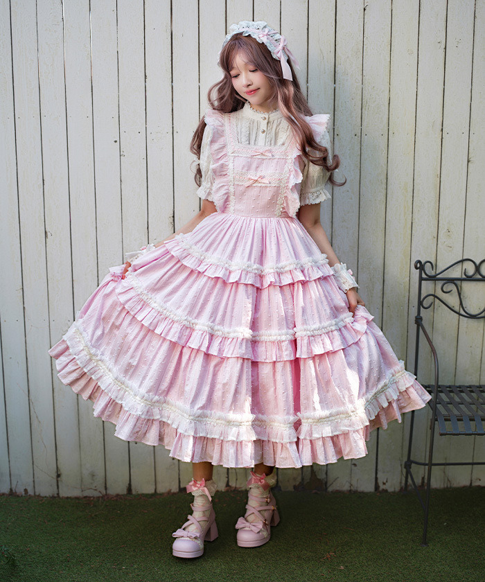 【設計】 三段式拼接裙身加入大量抓皺設計,呈現華麗豐富的層次感。 胸前點綴梯形蕾絲並搭配小巧蝴蝶結,細節甜美精緻。 肩帶同樣加入荷葉邊設計,整體更顯可愛感。 採用透氣的絡紗多比(Karami Dobby)面料,十分適合春夏季節穿著。