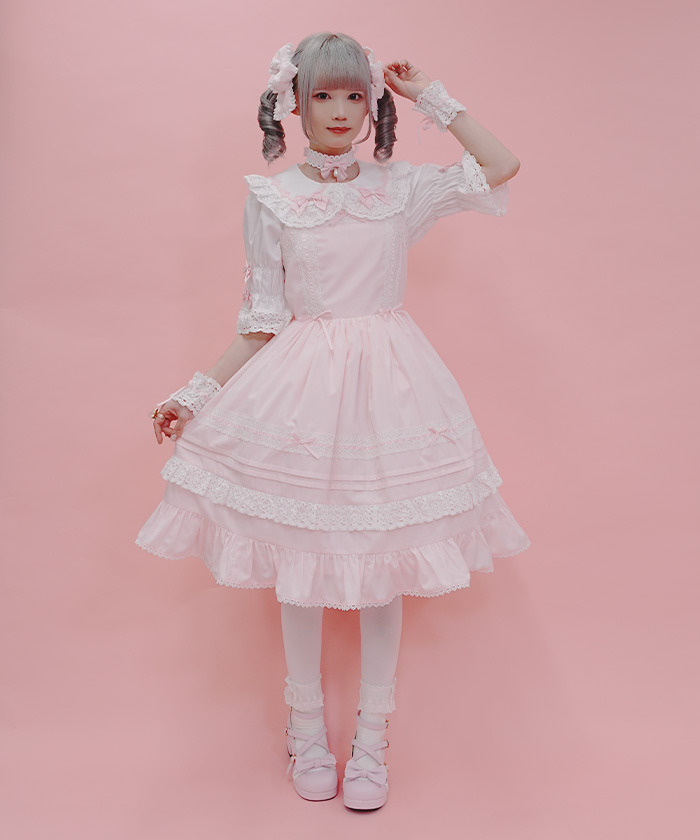 【商品介紹】 這款吊帶洋裝以梯形蕾絲為亮點,打造甜美娃娃風格。領口、裙身與裙擺細緻點綴蕾絲,搭配霧面緞帶蝴蝶結,整體柔和可愛,棉感材質四季皆可穿搭。