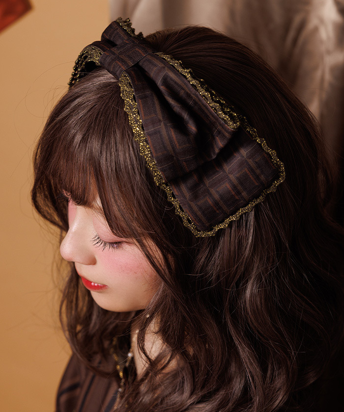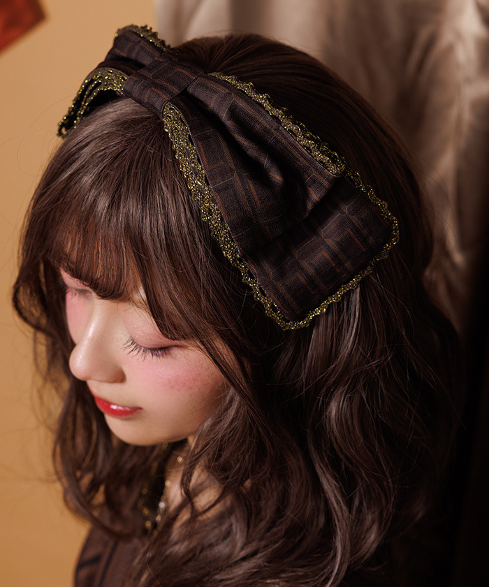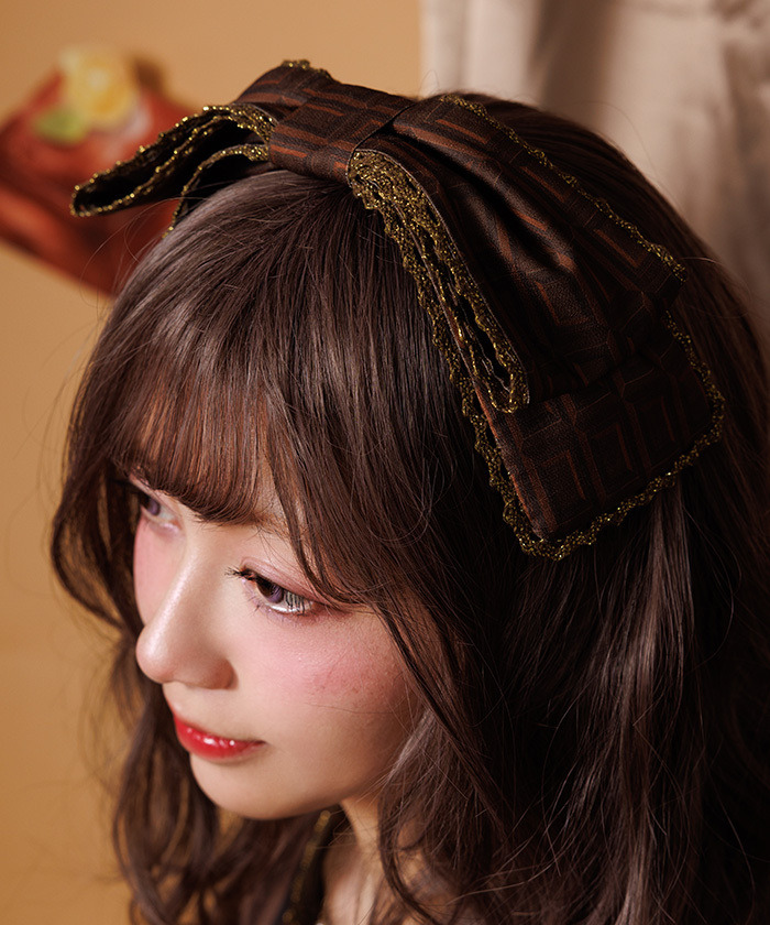【設計】 髮帶上有大尺寸板巧克力圖案蝴蝶結,蕾絲中加入金色亮粉點綴,增添閃亮感與高級感。