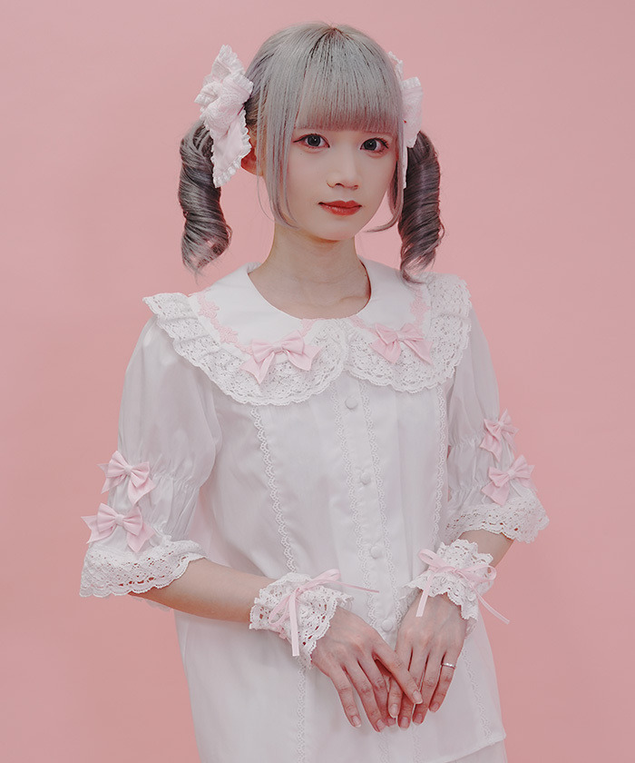 【設計】 配色蝴蝶結增添層次感,圓領結合蕾絲與玫瑰刺繡,細節精緻;袖口鬆緊設計呈現自然蓬鬆感,整體展現甜美又優雅的風格。