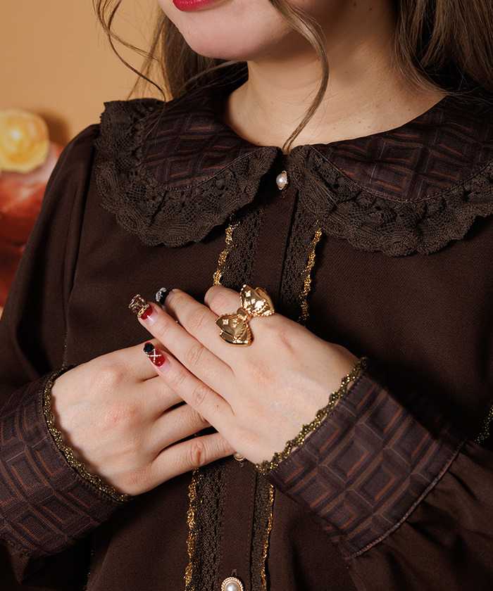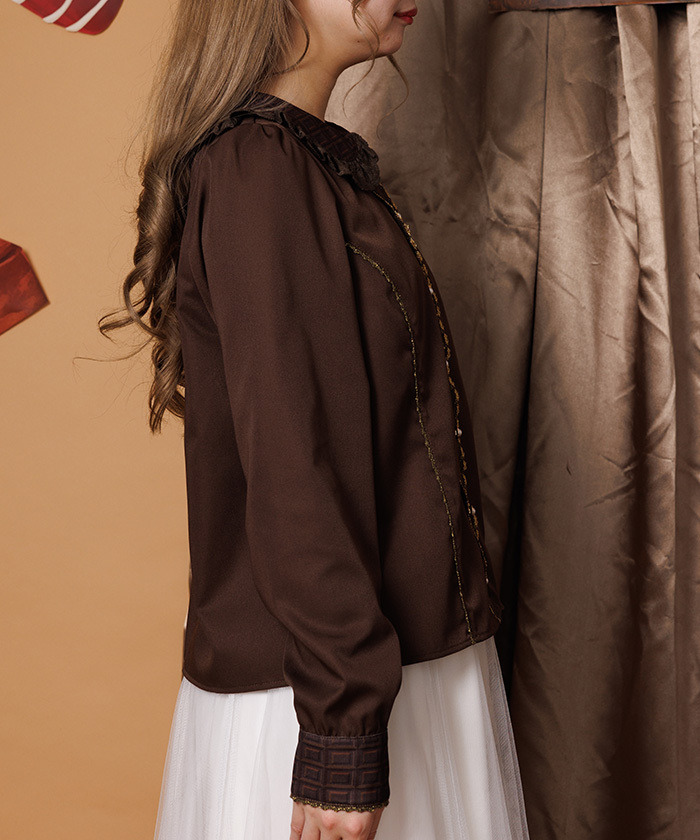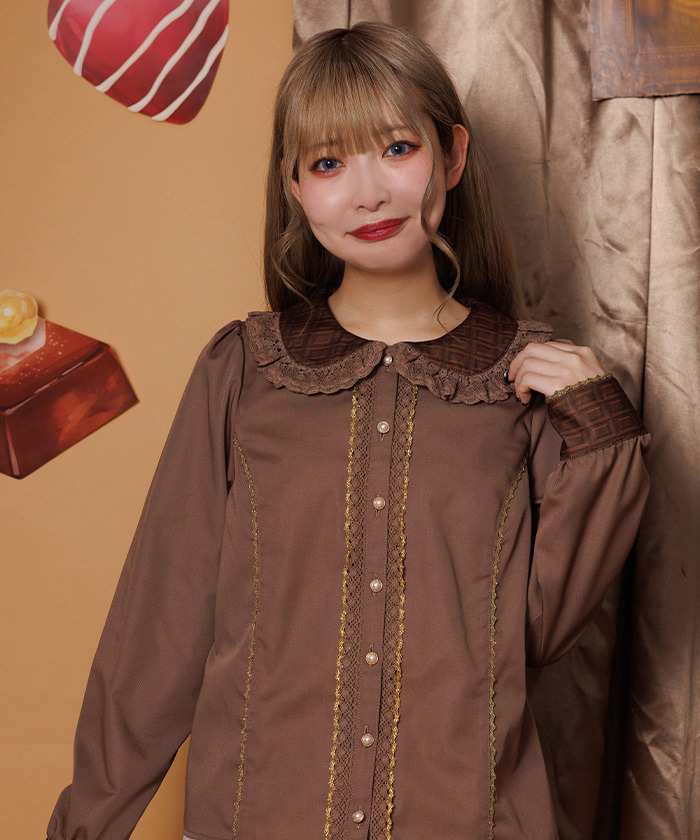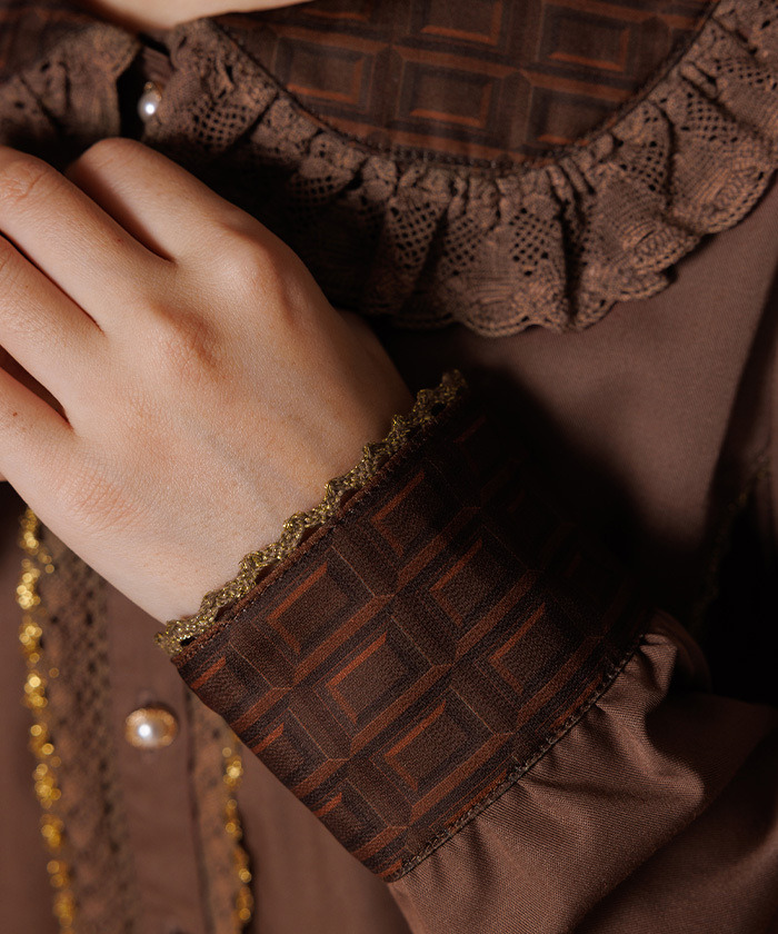 【設計】 襯衫以板巧克力圖案的領子與袖口為亮點,搭配細緻扭花蕾絲。共有兩色:以牛奶巧克力為靈感的淺色系,以及以苦巧克力為靈感的深色系。