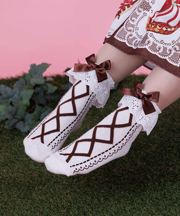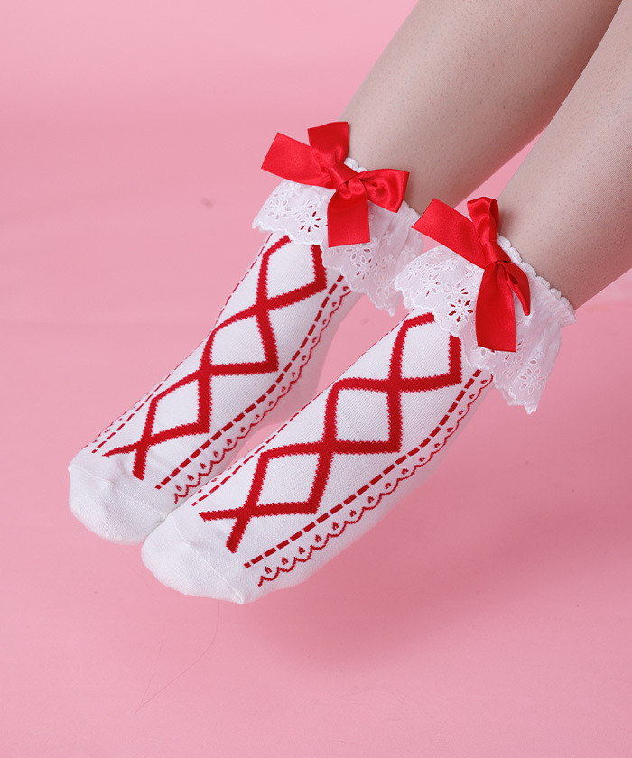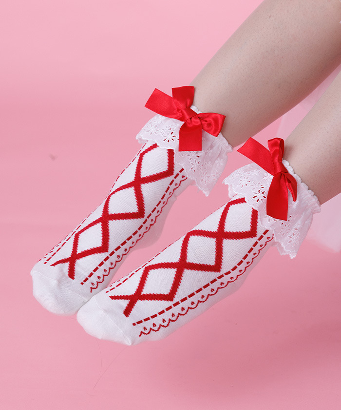 【設計】 襪口點綴棉質蕾絲與緞帶,從襪口到腳尖都是可愛的綁帶圖案♡