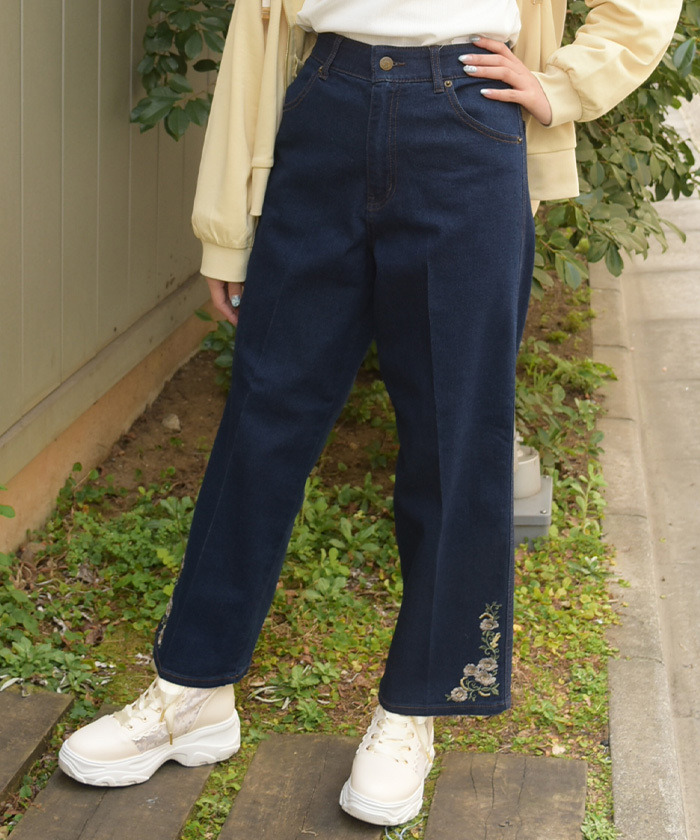 【設計】 內藏鬆緊腰頭提升舒適度,同時維持外觀整潔;彈性牛仔布料活動自在,褲腳刺繡低調點綴,融合休閒與柔美風格。