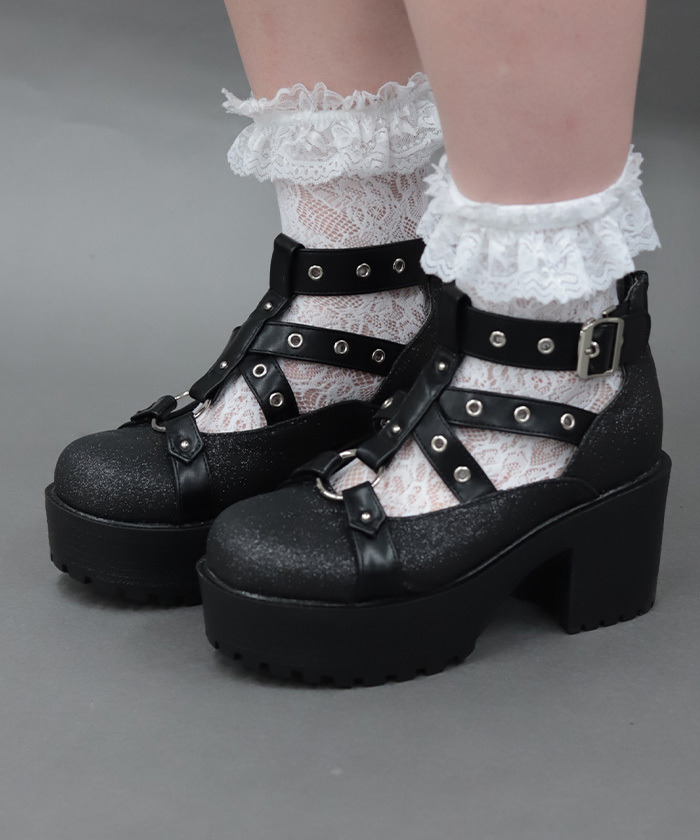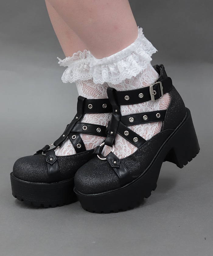 【商品介紹】 黑色亮粉厚底瑪麗珍高跟鞋,結合金屬扣帶與粗跟設計,打造甜酷混搭風格的日系厚底鞋款。