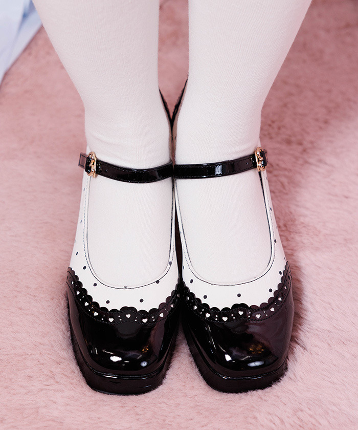 【設計】 採用格紋×仿皮革、圓點×亮面漆皮的異材質拼接設計,展現滿滿少女感。搭配愛心造型扣環與波浪剪裁細節,甜美度再升級。鞋跟高低差小,內側附有柔軟緩衝墊,長時間行走也不易疲勞,兼具造型與實用性。