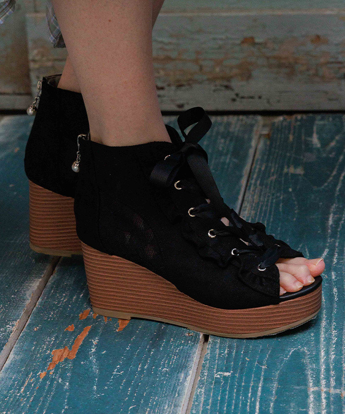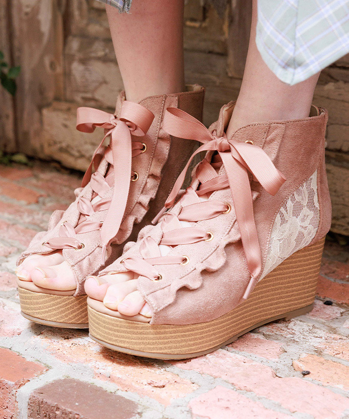 【商品介紹】 以華麗綁帶與側邊蕾絲拼接為亮點的涼鞋登場。