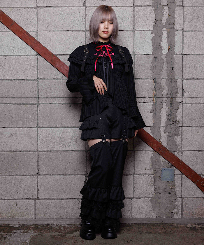 【穿搭建議】 建議與露肩荷葉邊上衣 搭配,打造略帶 Y2K 感的哥德風褲裝造型。