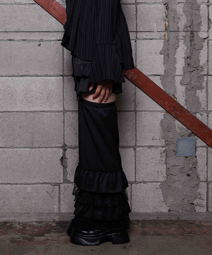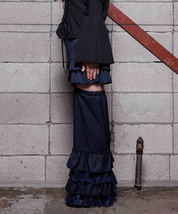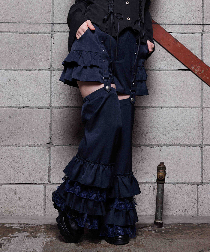 【設計】 這款分離式褲款搭配分段荷葉邊褲腿套設計,增添層次感與造型感。 褲腿套可拆卸,靈活穿搭。 褲身本體搭配荷葉邊與鉚釘裝飾,設計感十足。 褲腿套口採彈性設計,舒適貼合腿型。