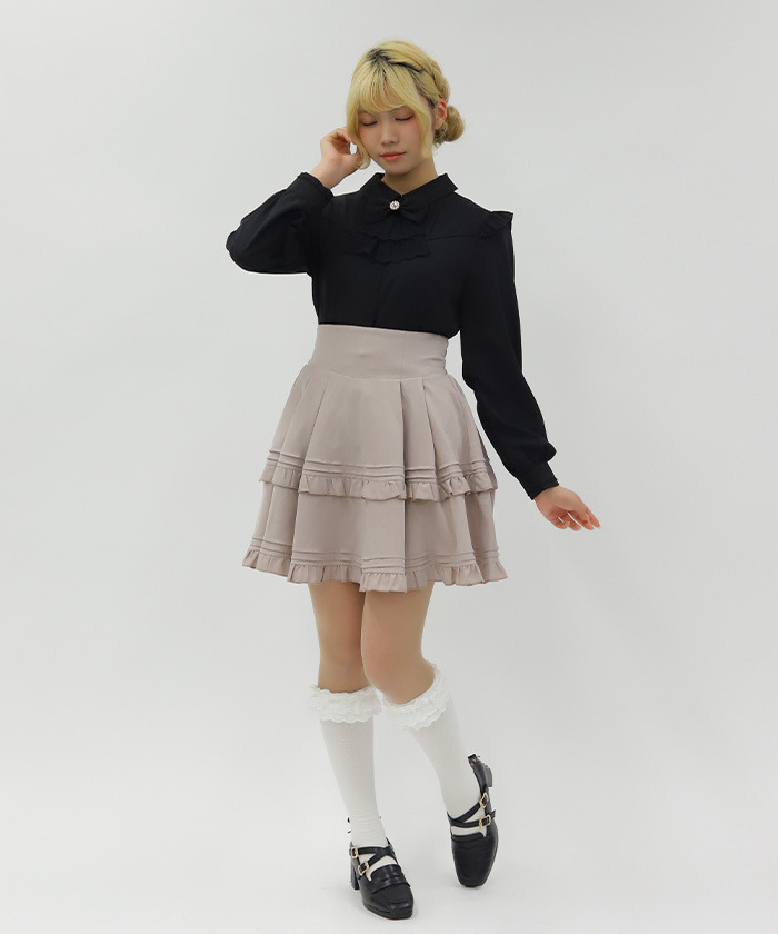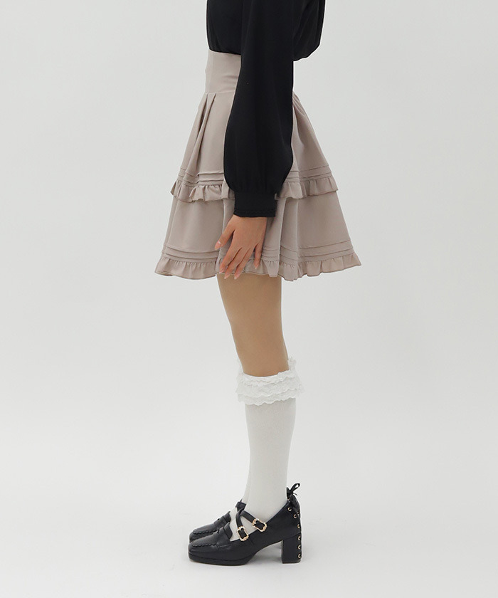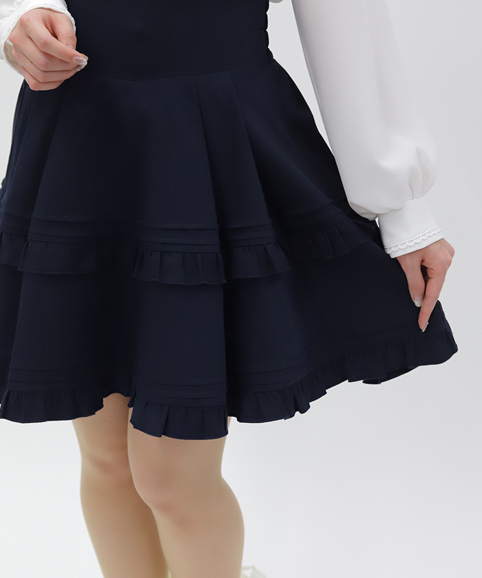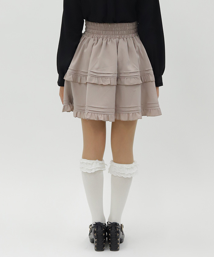 【設計】 高腰版型有效拉長腿部比例,展現修長身形。運用壓褶與荷葉元素增添學院風格層次感,巧妙修飾腰部線條。後腰採柔軟鬆緊設計提升舒適度,內附安全褲設計,活動時也能安心自在。
