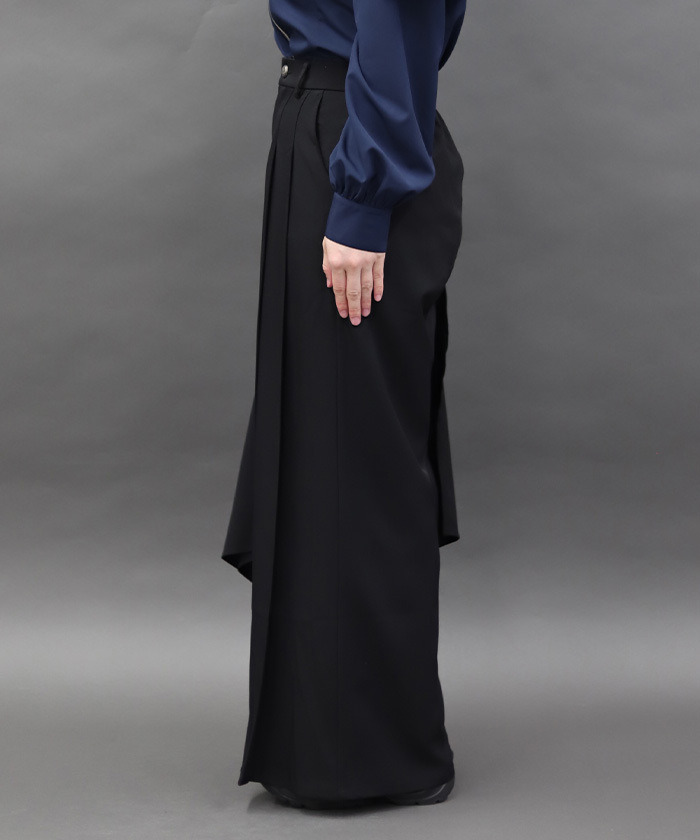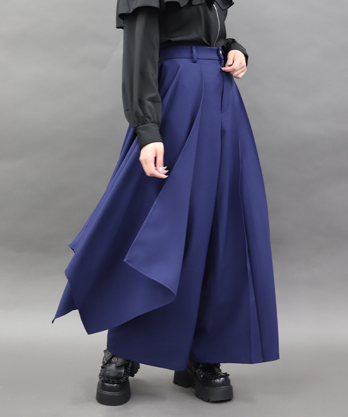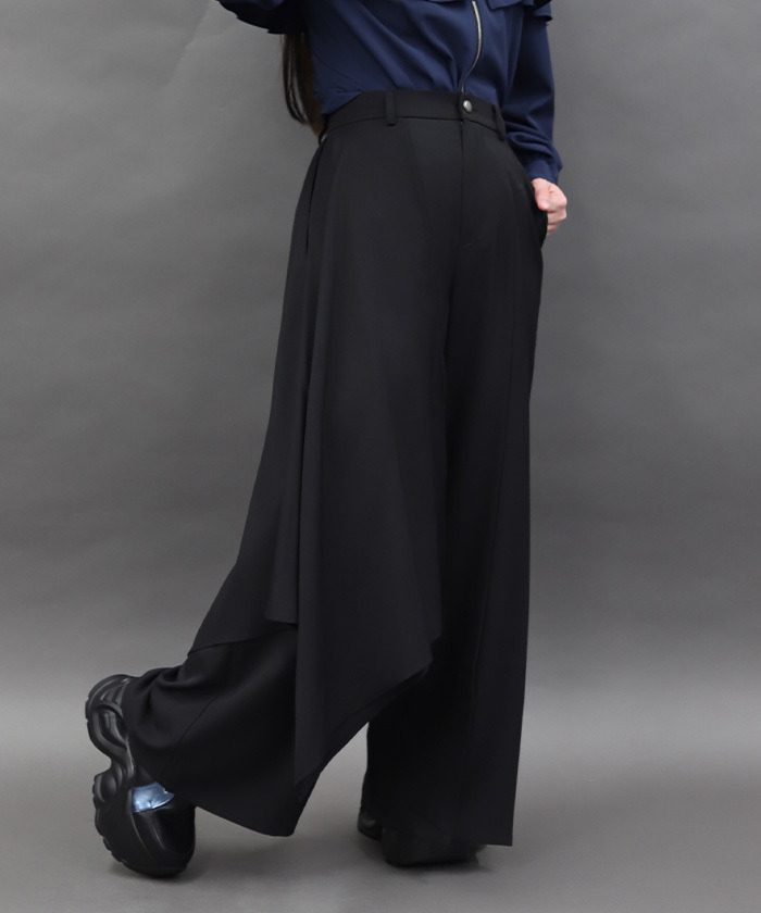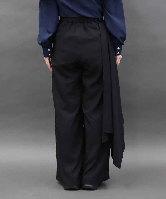 【設計】 採用修長俐落的寬褲剪裁,側邊不對稱荷葉設計營造層次感與流動感,呈現強烈的時尚氛圍。後腰鬆緊設計增加彈性與舒適度,兼顧美感與穿著自在感。