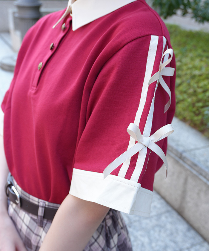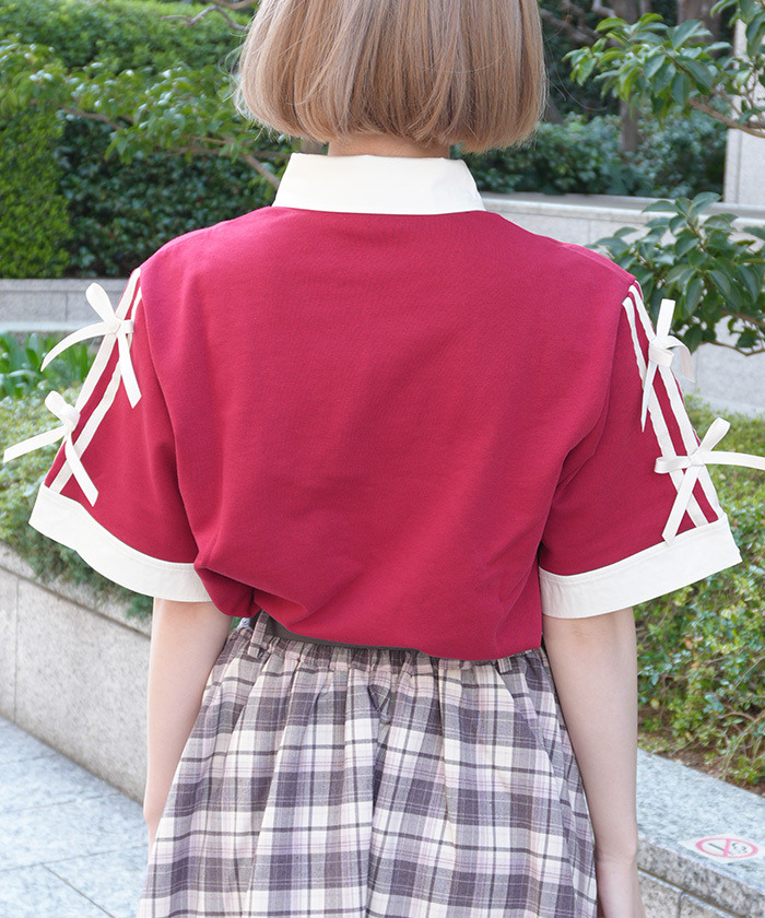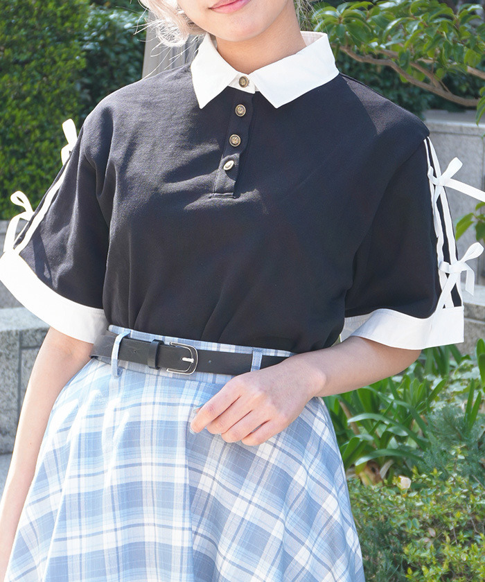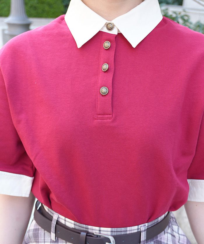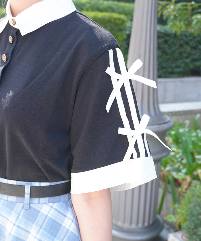 【設計】 以襯衫布與棉質上衣拼接呈現層次感,撞色設計增添視覺亮點。領口搭配雙蝴蝶結與線條元素,展現濃厚學院風氣息。點綴徽章風金色鈕扣,為整體造型增添精緻感。