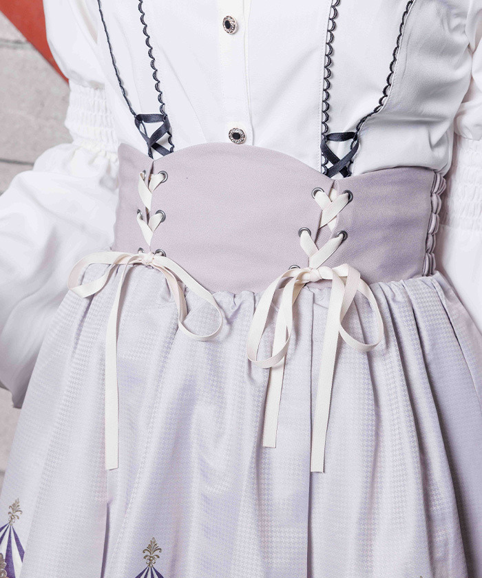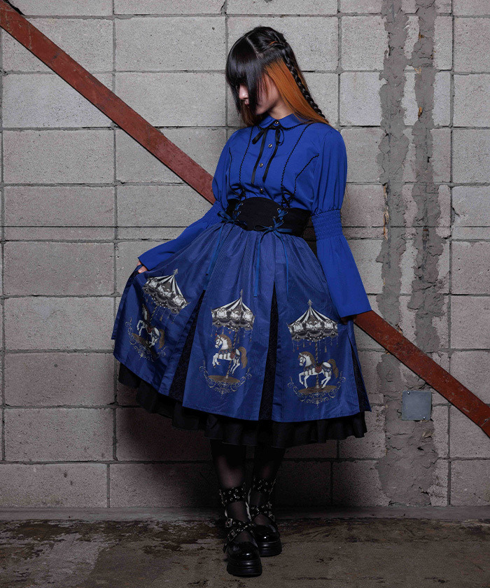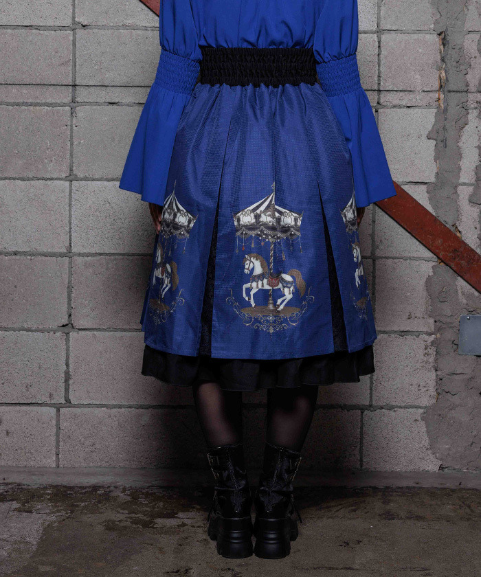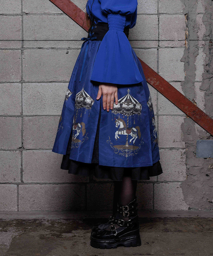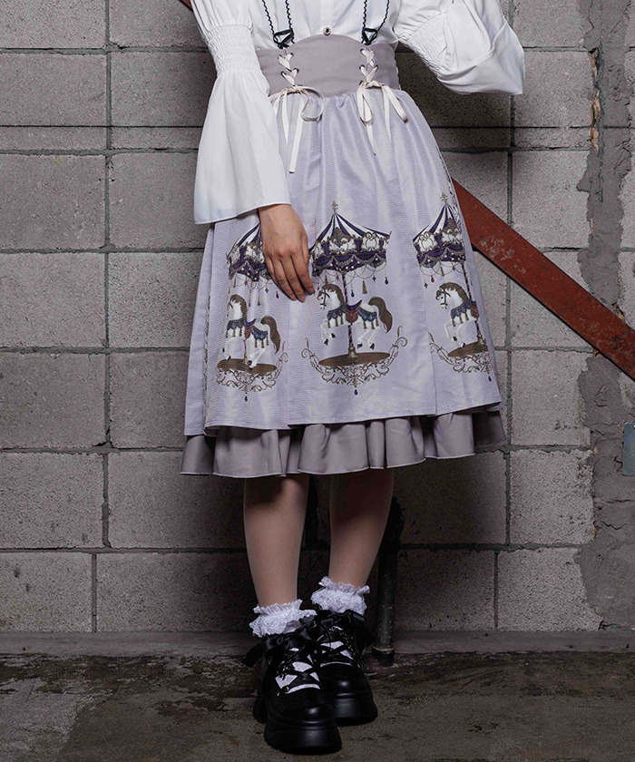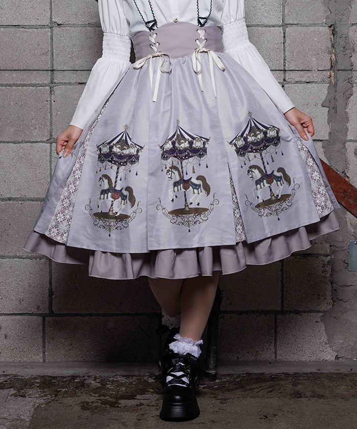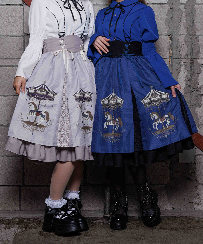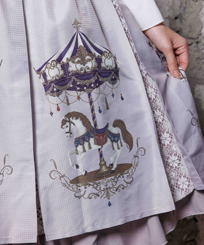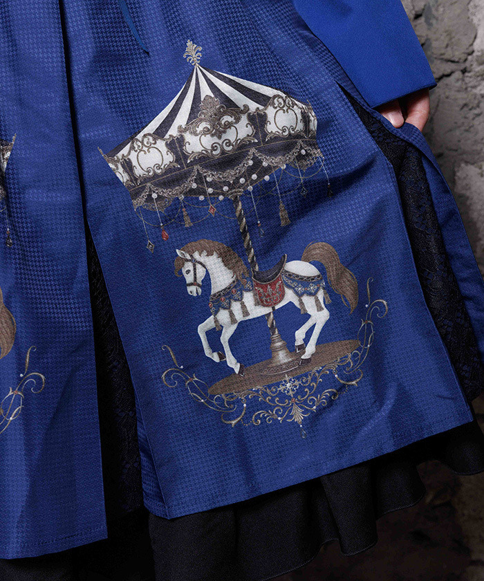 【設計】 融入 2026 年幸運象徵「馬」的元素,將白晝與夜晚呈現不同氛圍的旋轉木馬圖案化為印花設計。提供被溫柔光芒包圍的灰米色,以及沉浸於夜色中的藍色兩種配色。裙身輪廓自然蓬鬆,也可搭配內襯裙增加層次感。