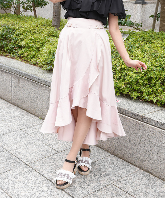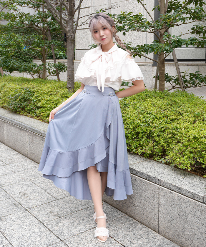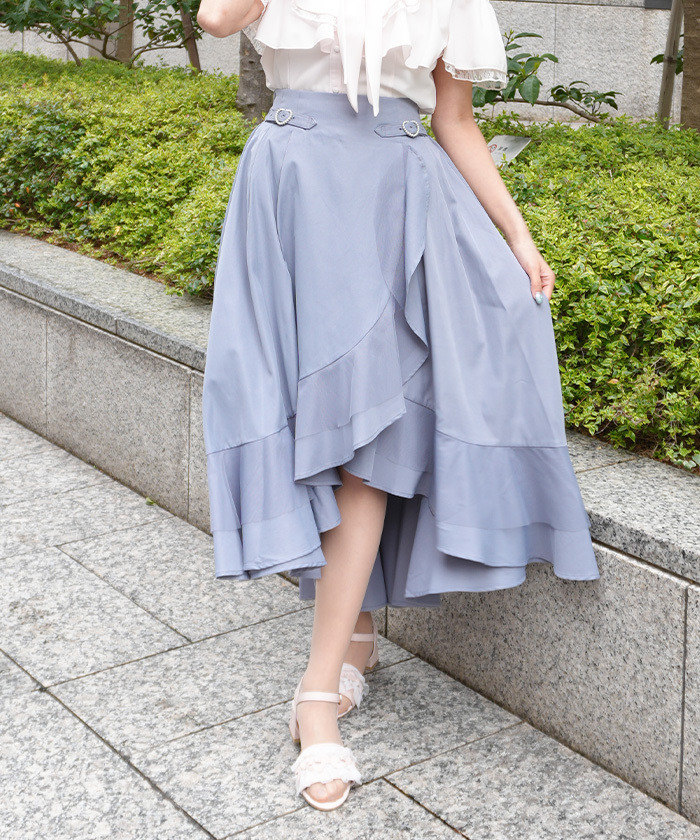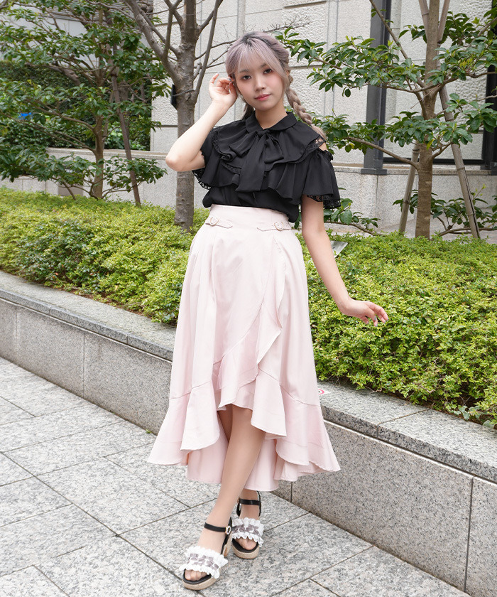 【設計】 以多層薄紗打造的荷葉邊設計,呈現立體華麗感。前短後長的不規則裙擺增添動感層次,高腰剪裁修飾身形。腰間搭配愛心扣環皮帶設計,甜美中帶亮點,後腰鬆緊方便穿脫。
